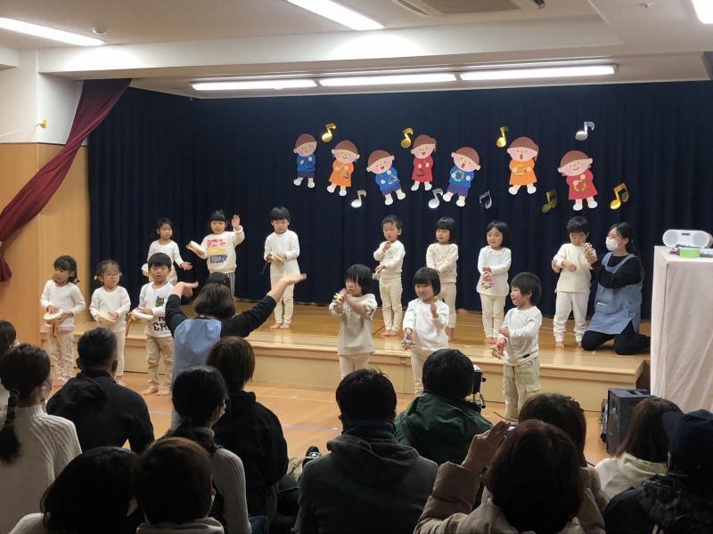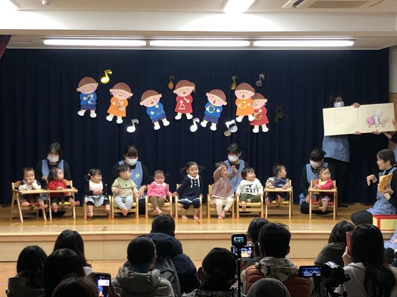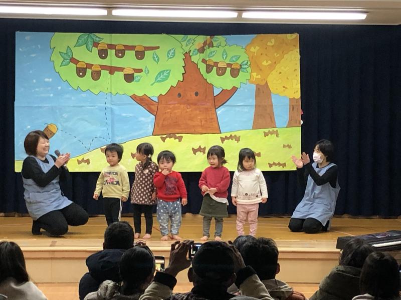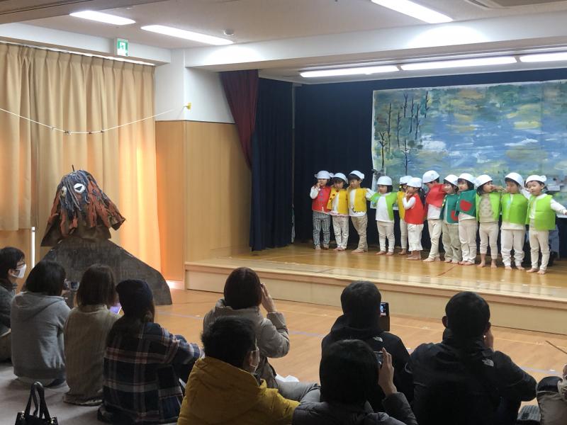 0歳は朝の会の様子を、1歳はどんぐり拾いの散歩の様子を紹介しました。2歳はてんとう虫とカナヘビさんとの交流劇、3歳はトロルに立ち向かう子羊たちの劇でした。歌や合奏もありました。