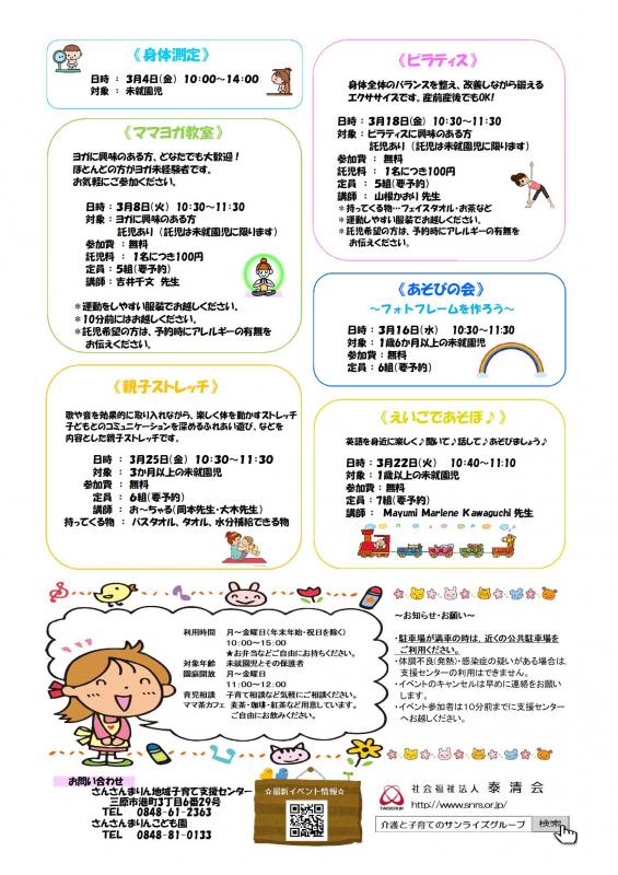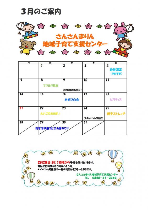 現在,蔓延防止等重点措置が2月21日~3月6日まで延長されておりますが,子育て支援センターの運営については,三原市より来館を可能とするよう要請がありました。そこで,本支援センターでは,人数制限を設けて本日21日より開館いたします。ご利用を希望される方は,できるだけ事前に電話で予約をお願いいたします。直接おいでいただいても利用は可能ですが,利用者が多数の場合は予約者を優先させていただきますのでご了承ください。