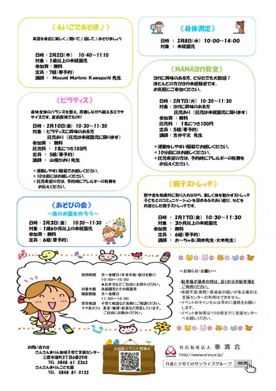 こちらをクリック ⇒ さんさんまりん地域子育て支援センター 2月のご案内【PDF】