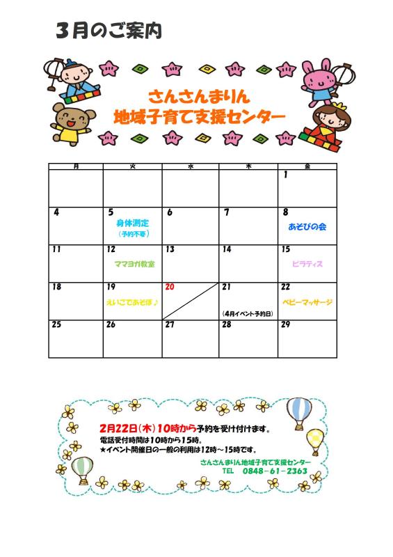 【さんさんまりん地域子育て支援センター】 3月のご予約は明日より受付です😍
