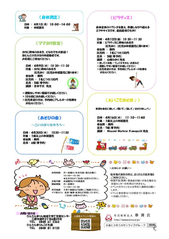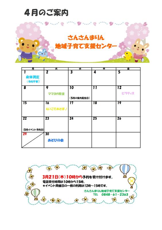 こちらをクリック ⇒ さんさんまりん地域子育て支援センター 4月のご案内【PDF】