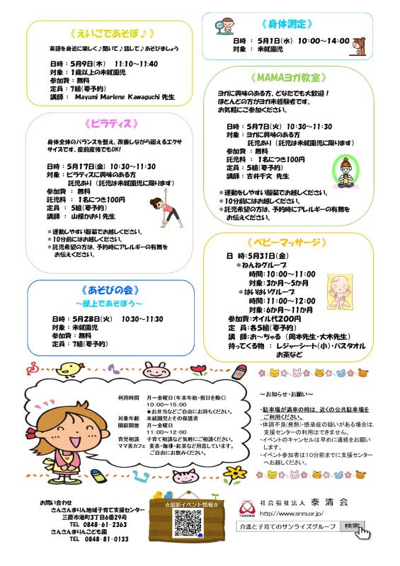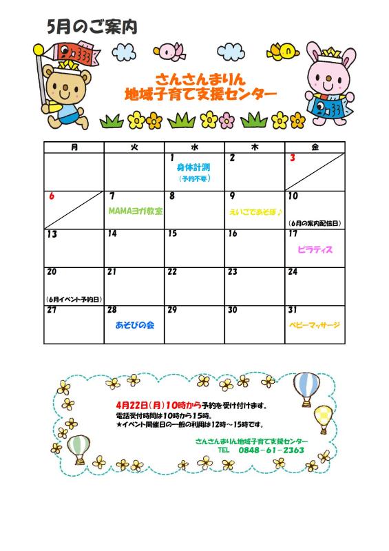 こちらをクリック ⇒ さんさんまりん地域子育て支援センター 5月のご案内【PDF】