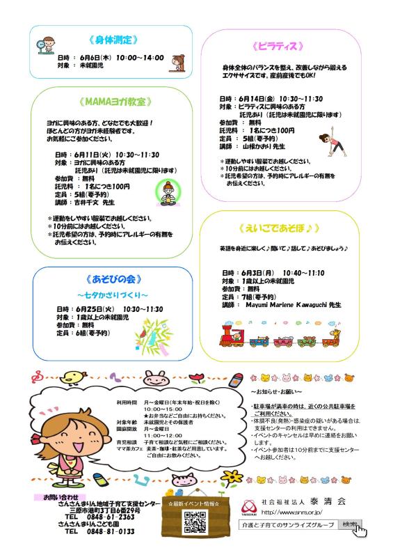 こちらをクリック ⇒ さんさんまりん地域子育て支援センター 6月のご案内【PDF】