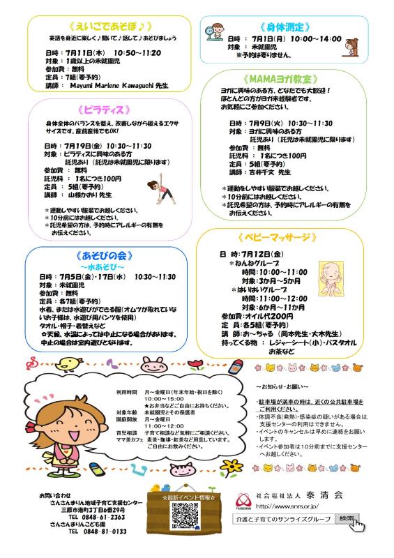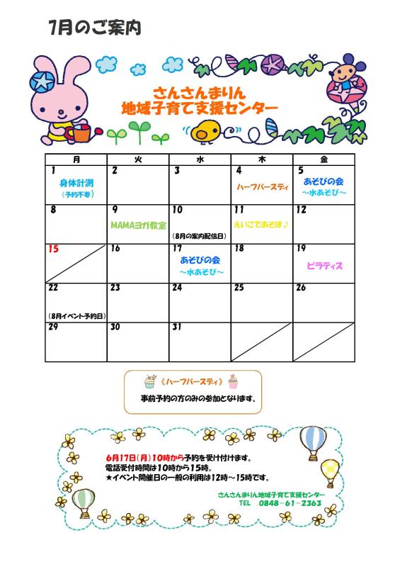 こちらをクリック ⇒ さんさんまりん地域子育て支援センター 7月のご案内【PDF】