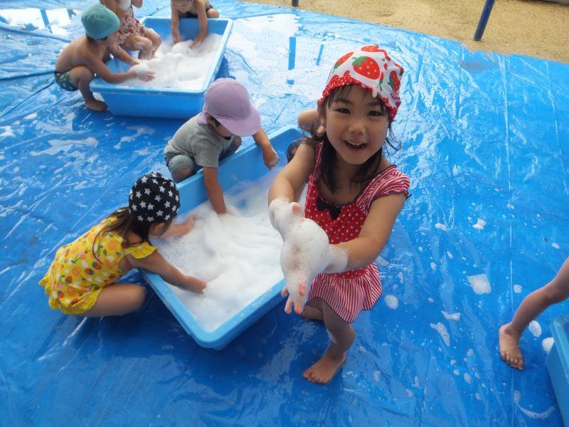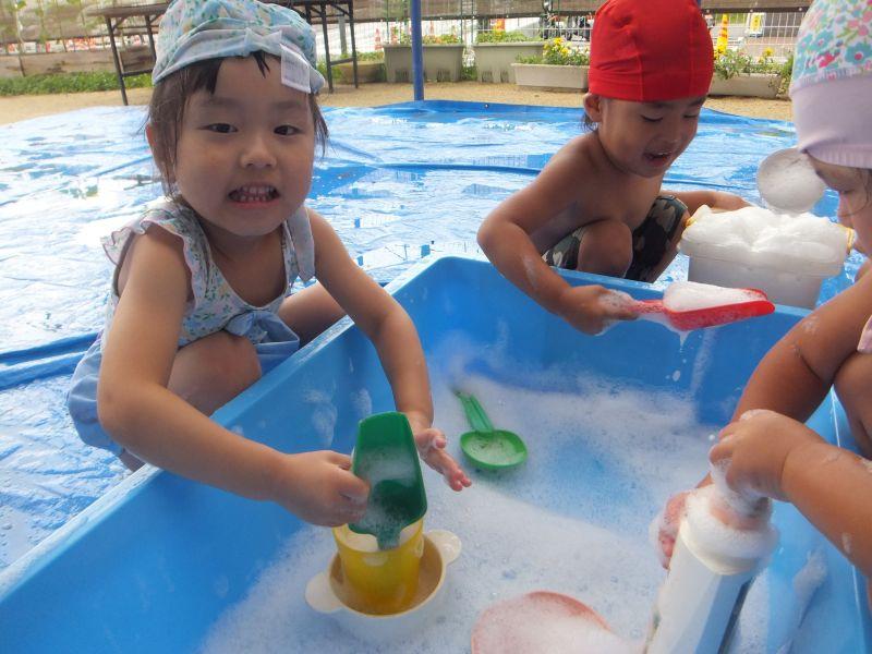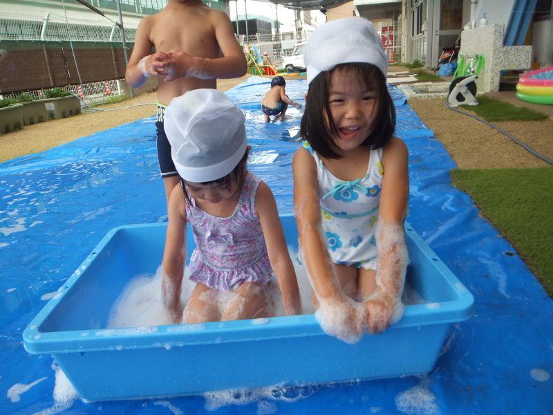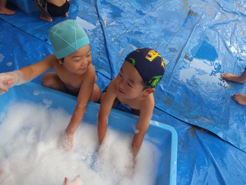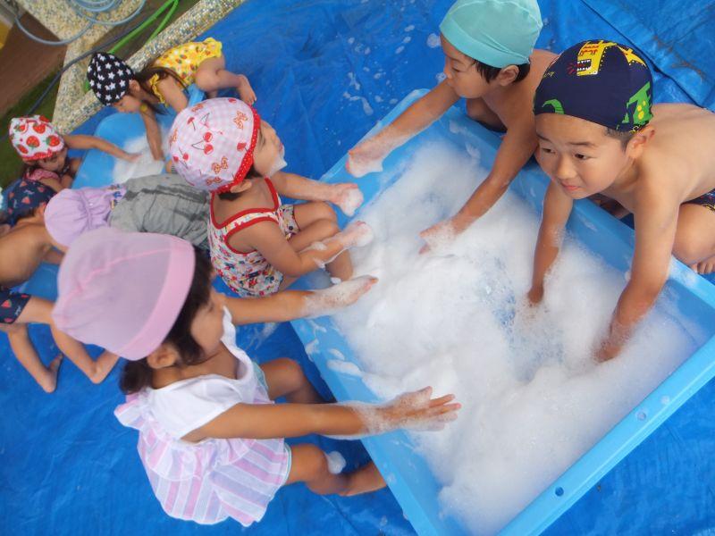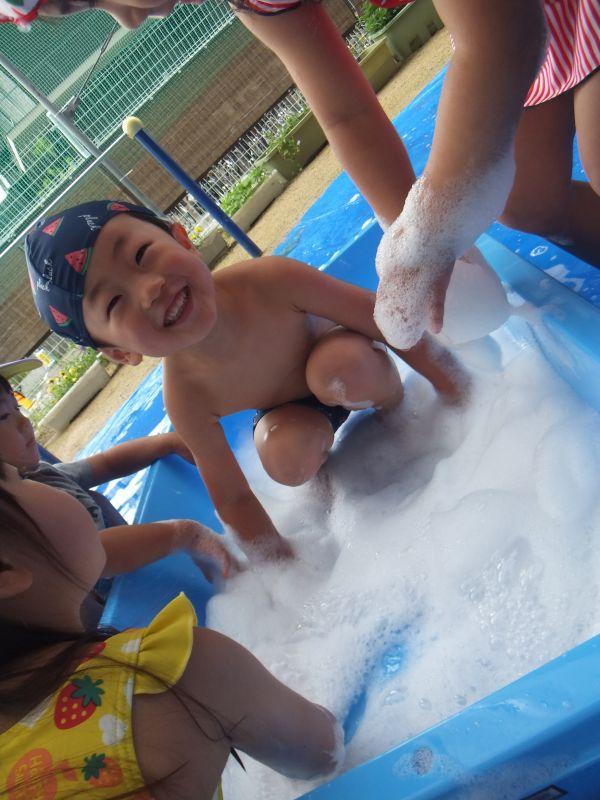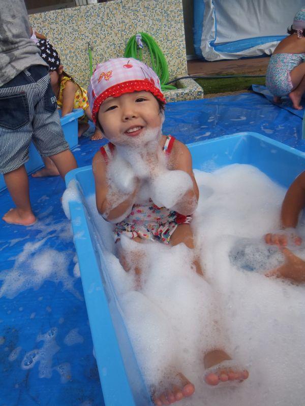 泡ぶろに入ったりソフトクリーム屋さんになったり,みんなで泡の感触を楽しみました♪♪