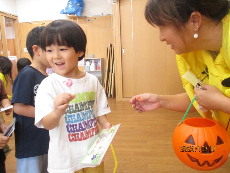 『Trick or Treat‼‼‼』の合言葉で仮装した講師の先生からシールとキャンディをもらって大喜びでした😊💛