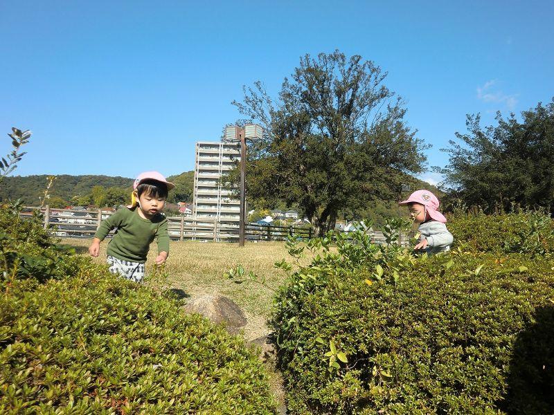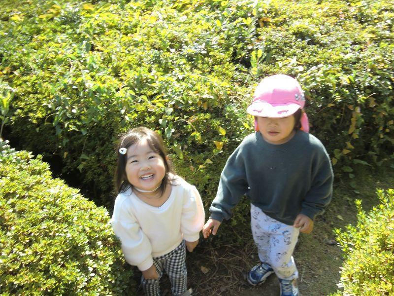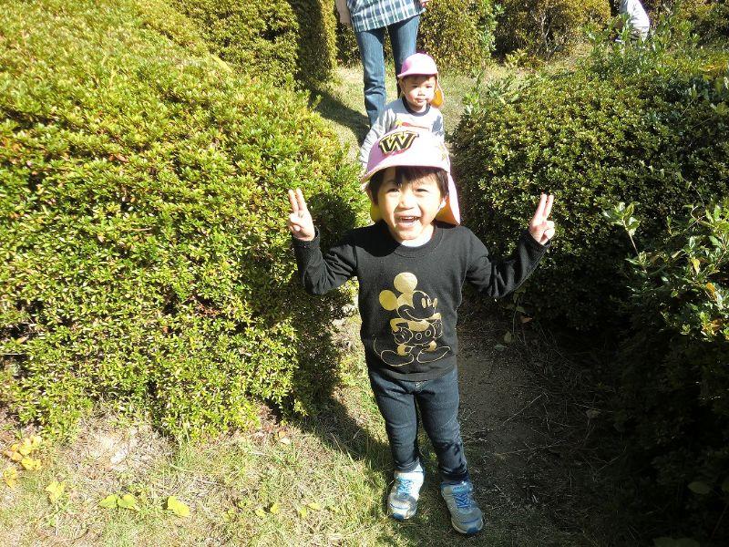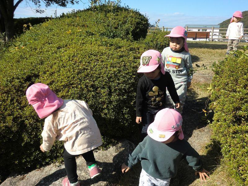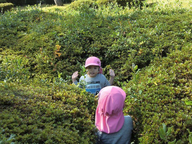 どんぐりや色づいた落ち葉を拾って秋の自然に触れて楽しんだり、植木の迷路を