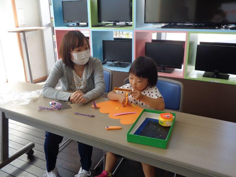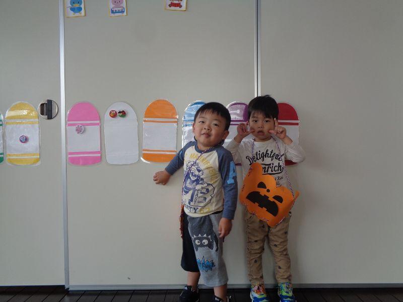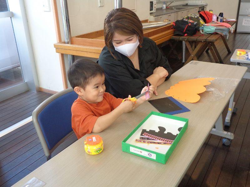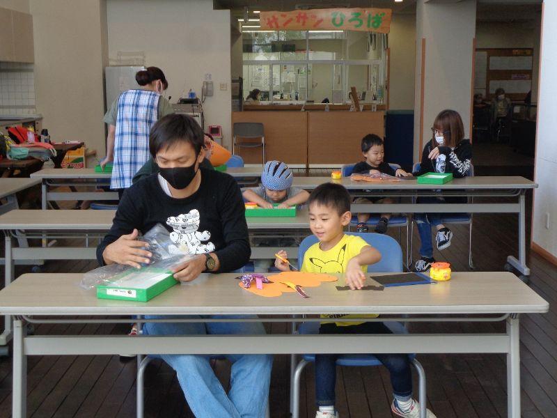 3歳児は、親子でハロウィンのかぼちゃのバッグを作成しました。