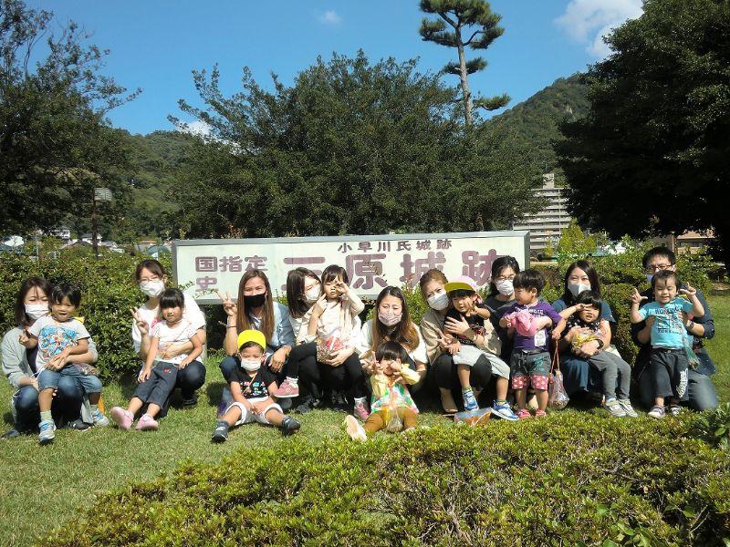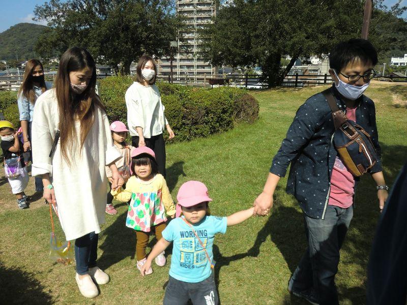 2歳児は、親子ふれあい散歩で城跡公園まで親子でお散歩し、どんぐり拾いなどを楽しみました。