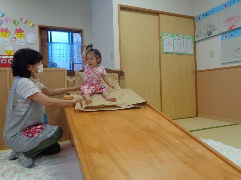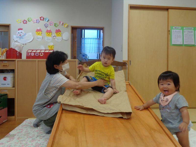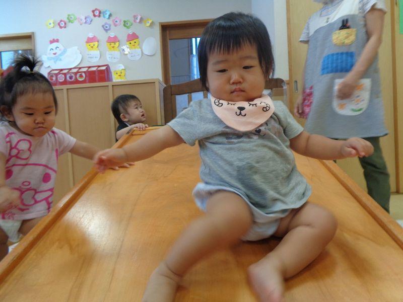 ひかり組(0歳児)さんが、巧技台のすべり台で遊びました!