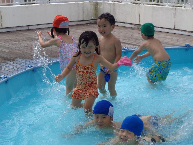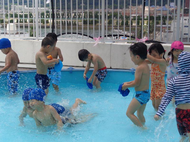 2歳児~5歳児は、クラスごとに時間を決めて屋上プールで遊びました。