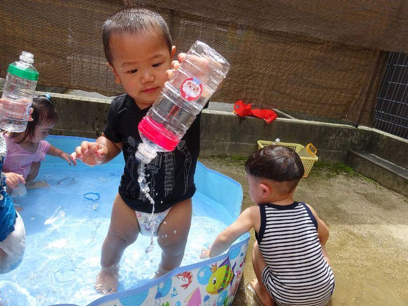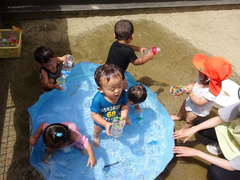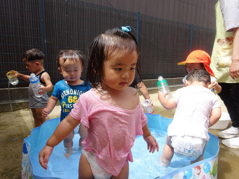 0歳児・1歳児クラスは、プールではなく園庭で水遊びをしました。