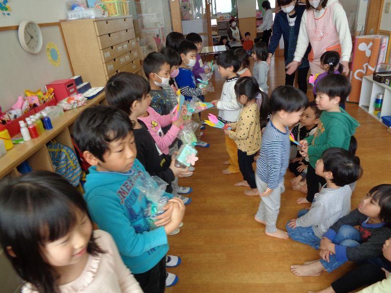 お別れ会では、卒園する5歳児のそら組さんへ4歳児・3歳児クラスの園児みんなから、プレゼントが贈られました。そして、卒園する5歳児さん1人ひとり、『小学校で頑張る事』を発表しました。