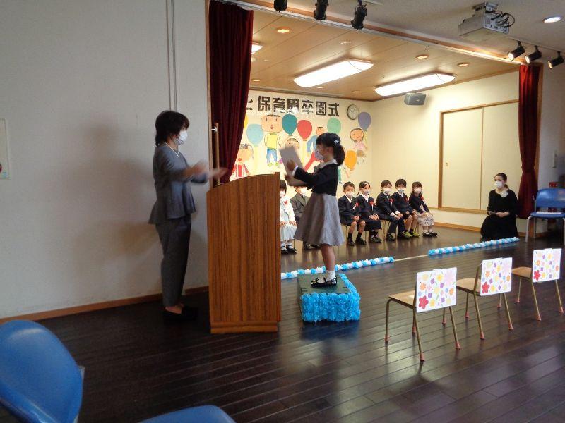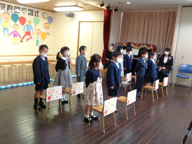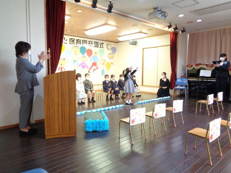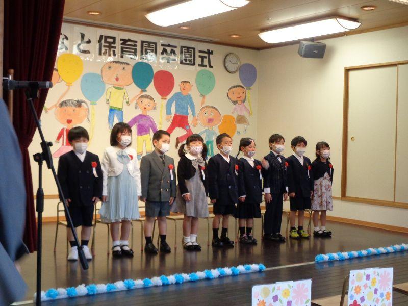 コロナウイルス感染症の影響で、卒園式の内容変更と参加者全員、手消毒・マスク着用という中ではありましたが、無事に卒園式が出来、9名の園児の成長したキラキラとした姿が見られて、とても良い卒園式になりました。小学校へ進学しても元気に頑張ってくださいね!