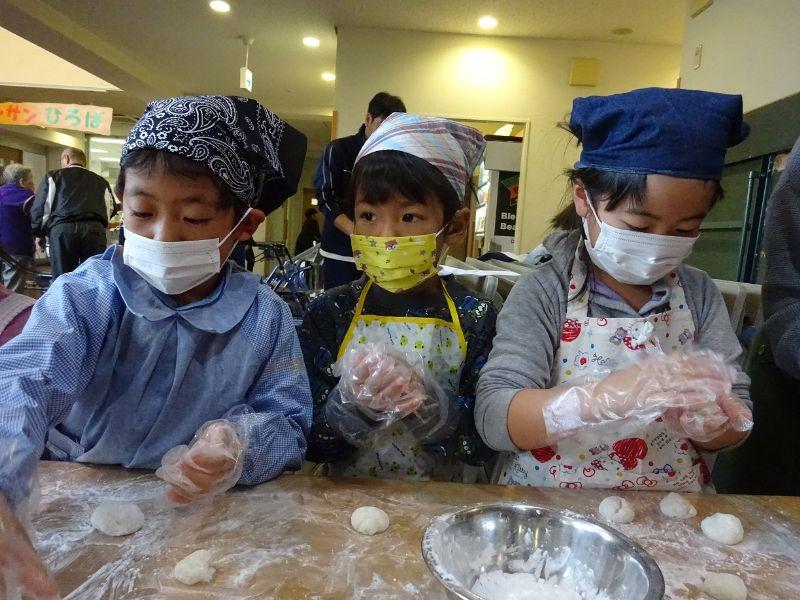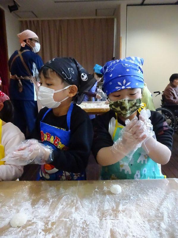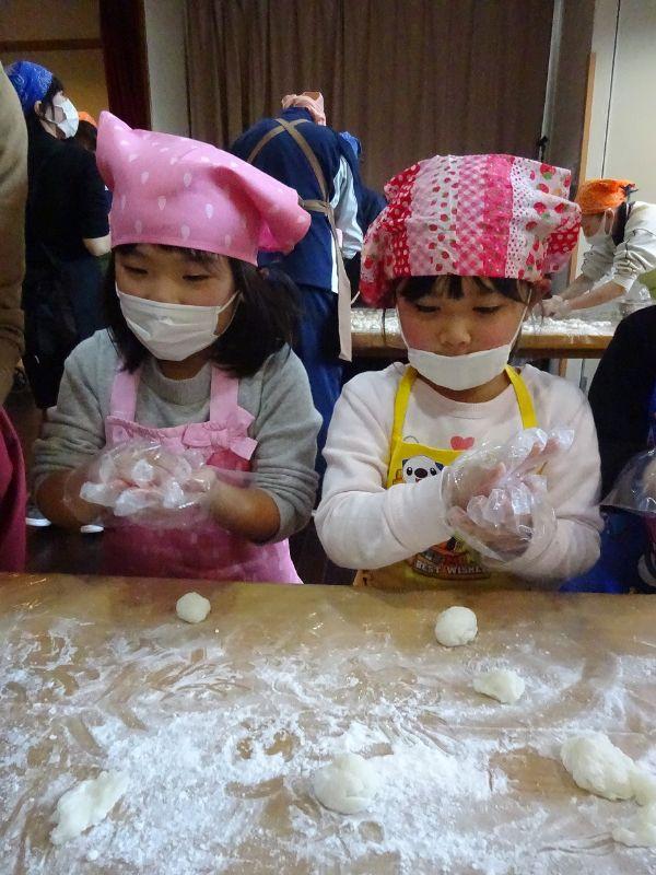 つきました。つきたての温かいお餅をみんな上手に丸めていました。