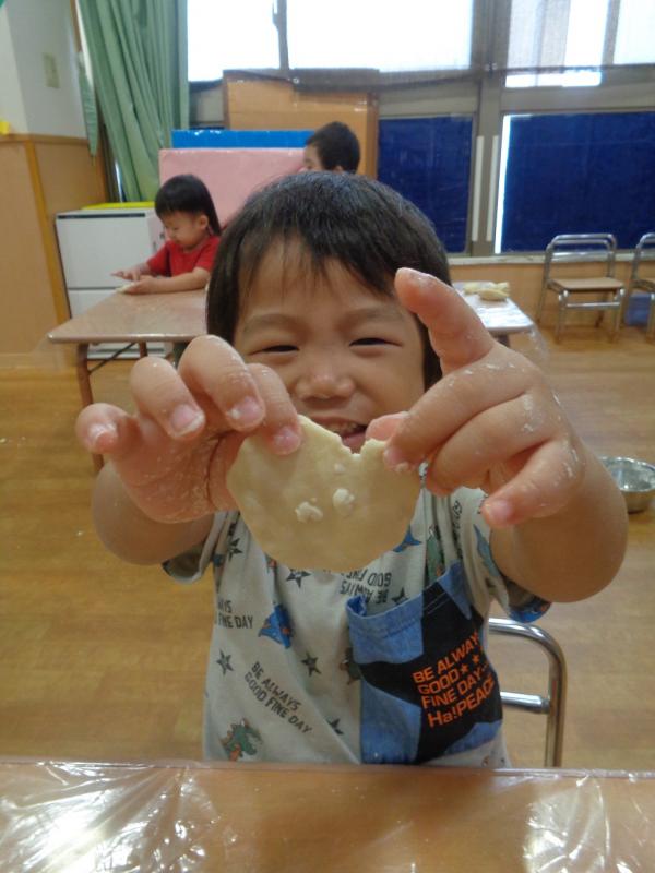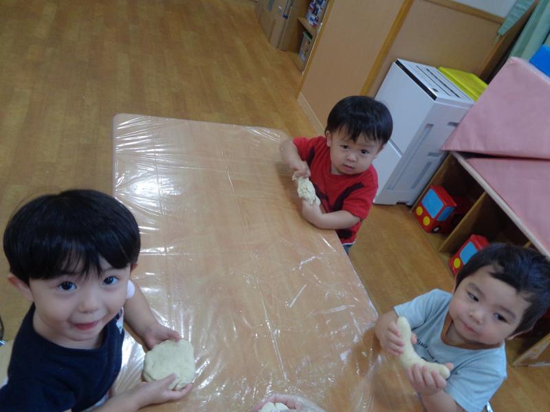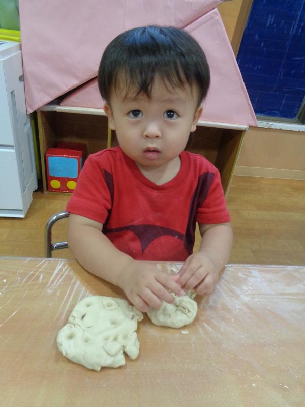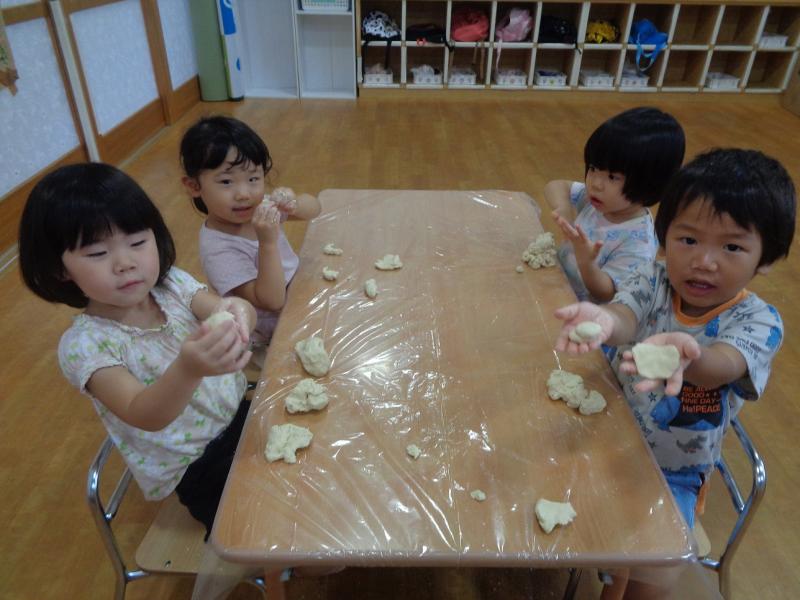 こねていきました。「べちゃべちゃね」「気持ちいいね」「お水入れようか」など