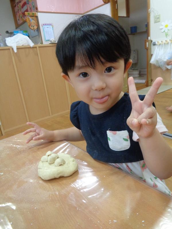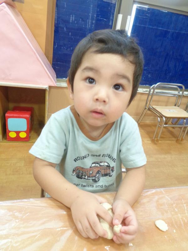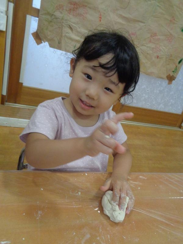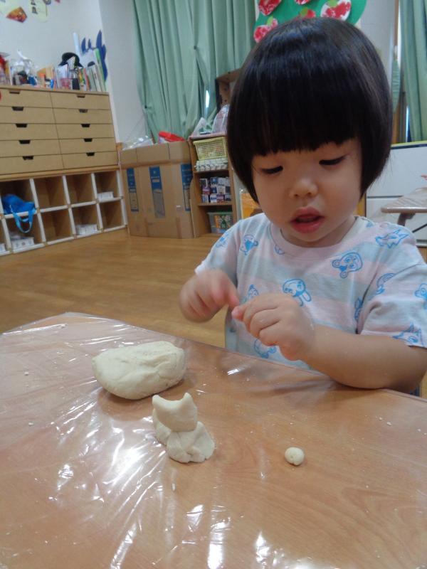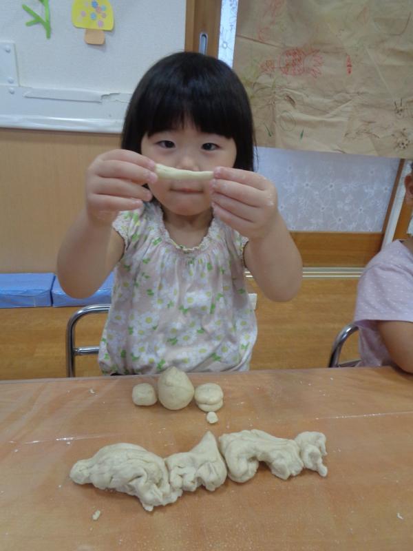 出来た小麦粉粘土を使って、ちぎったり、丸めたり、たたいて伸ばし、