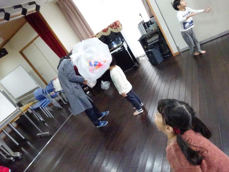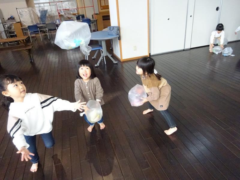 ピアノに合わせて動物になりきったり、フープなどの道具を使って体を動か