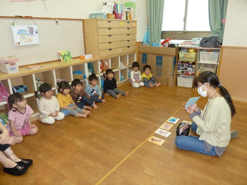 リトミックの先生の話を真剣に聞いてる子どもたち。