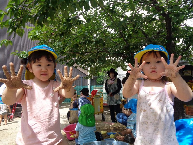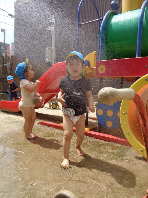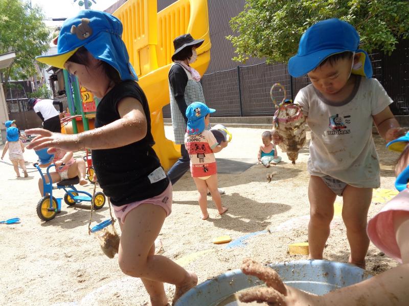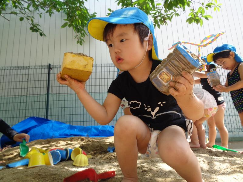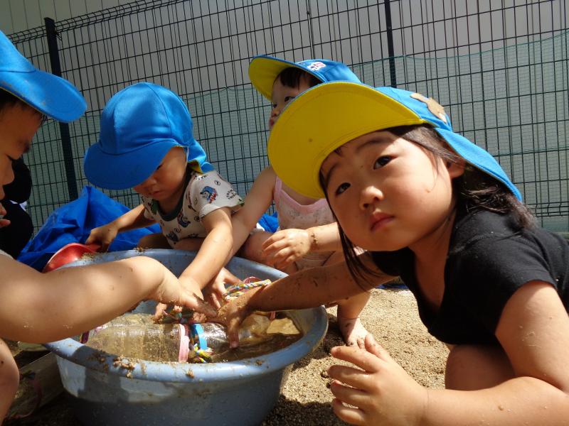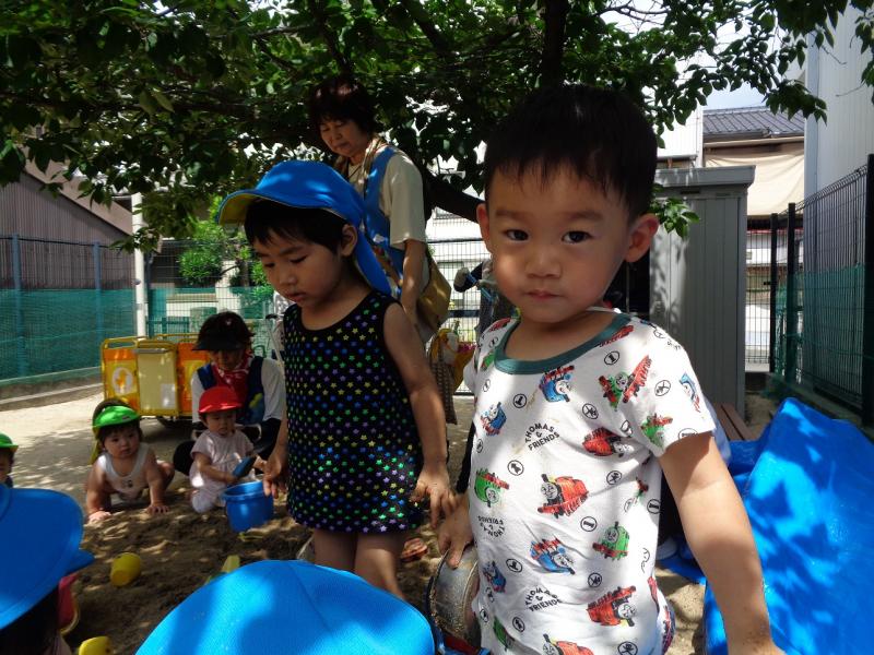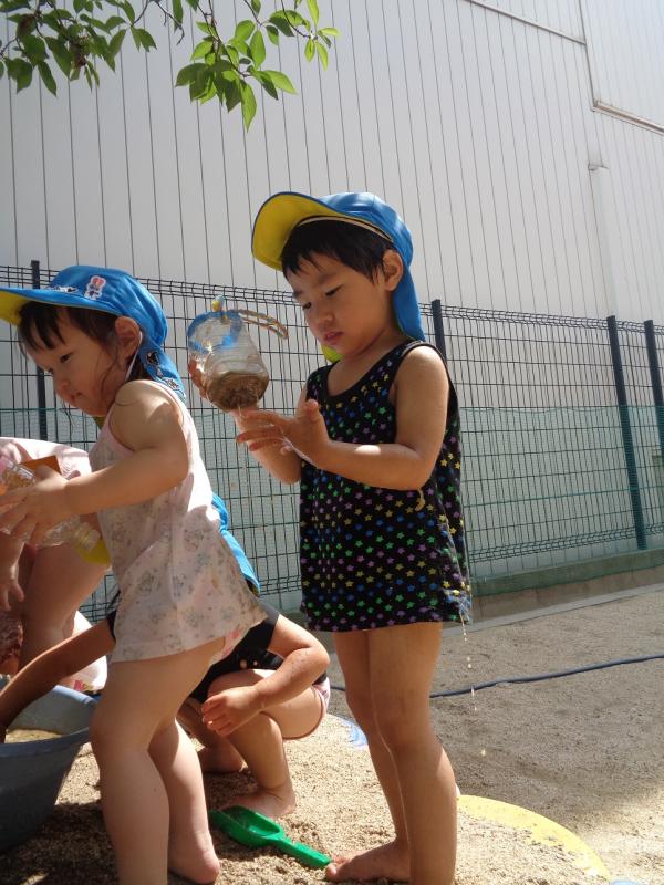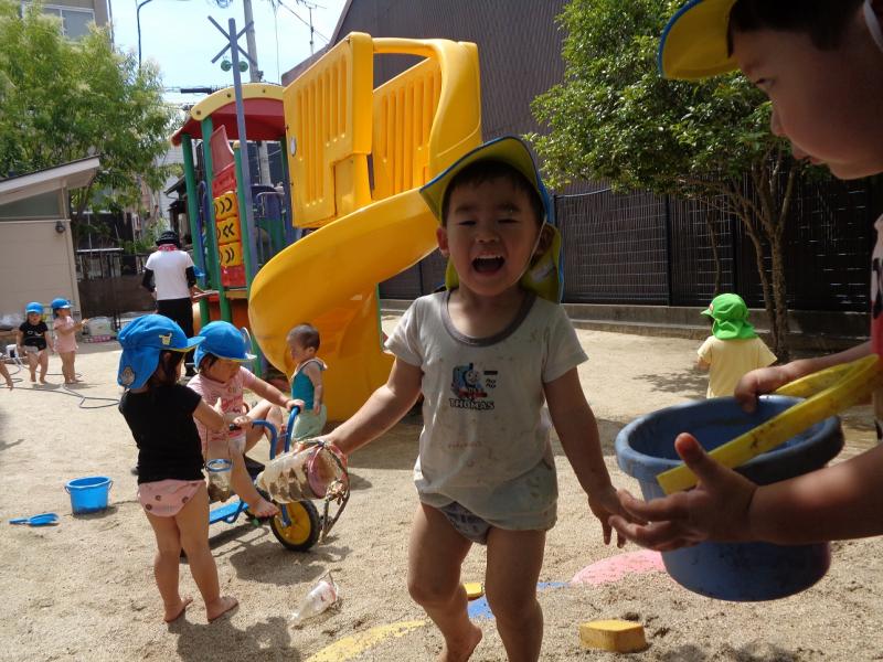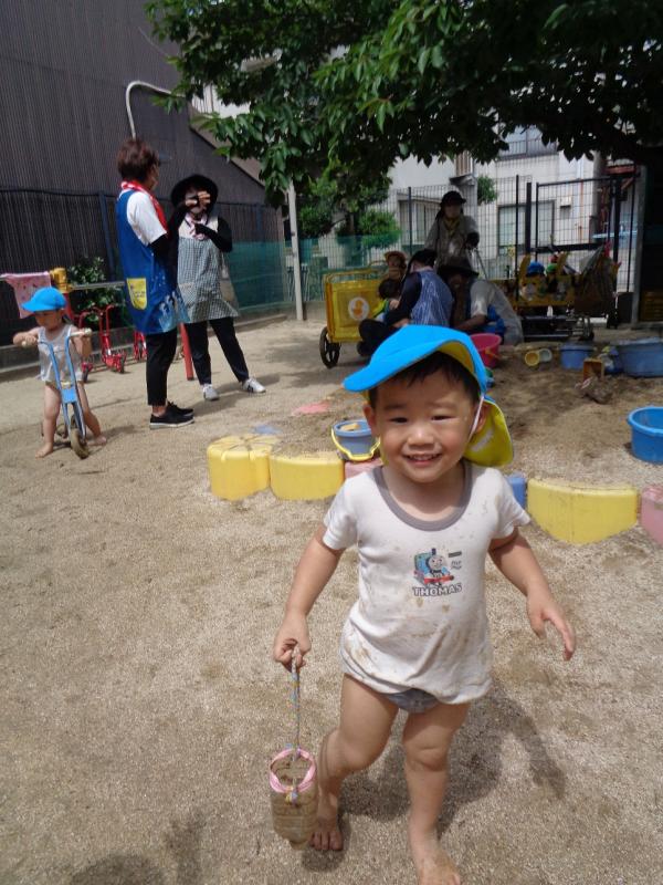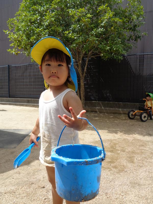 バケツに水を入れてスコップを持って、くるぐる~楽しいな~♡