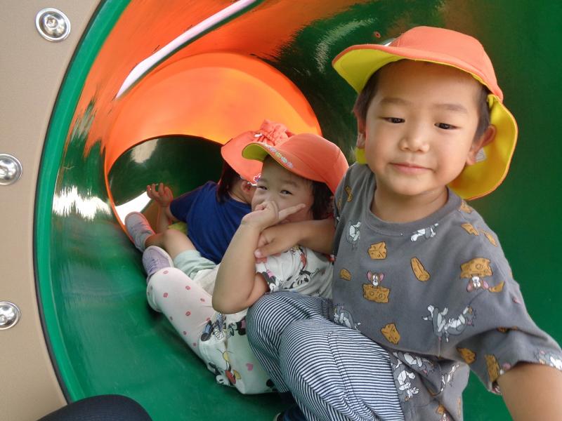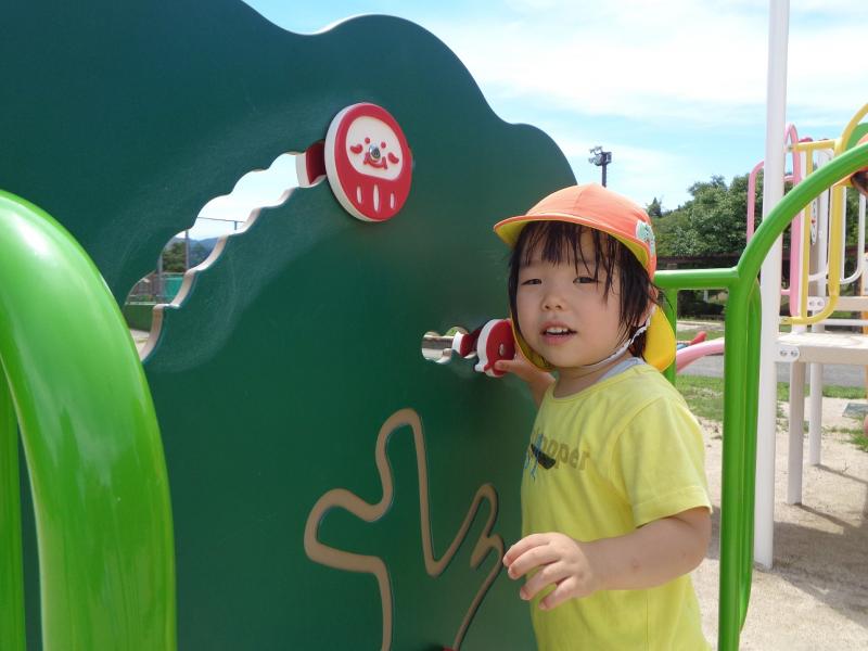 公園はとても暑く、こまめに水分補給しながら、筒の滑り台やユラユラゆれる