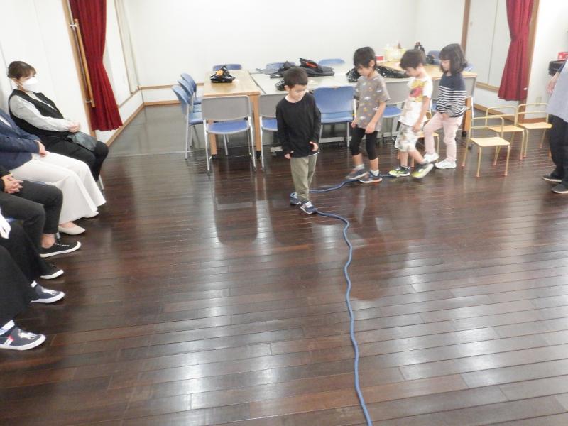 大好きな絵本「めっきらもっきらどおんどん」を見て、ちょこっと遊びは「縄あるき」を