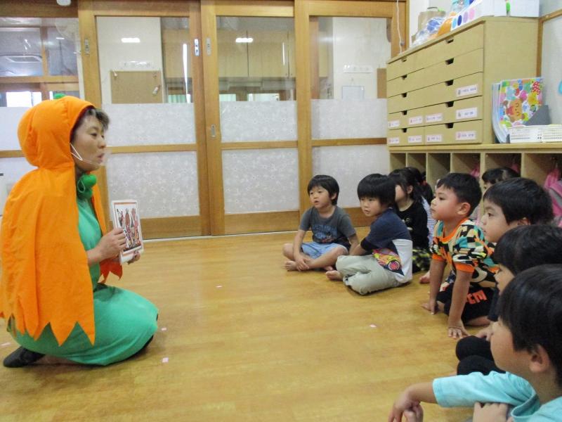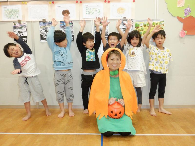 いつも楽しいえいご活動ですが、今月は、なんと先生がカボチャになって登場され