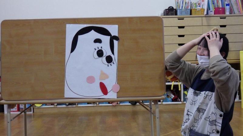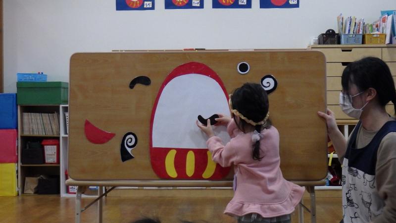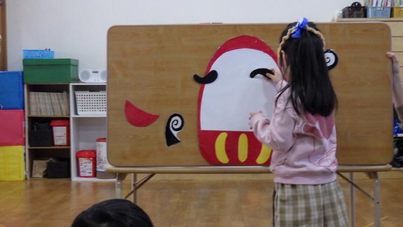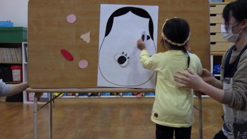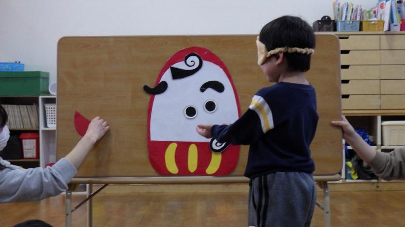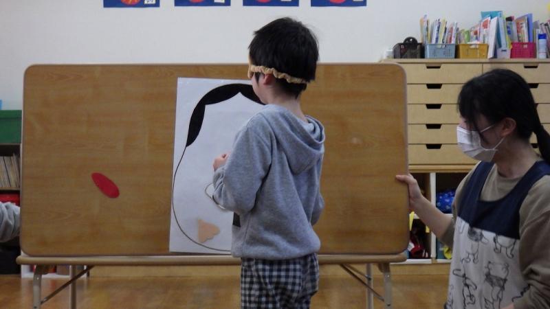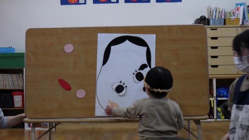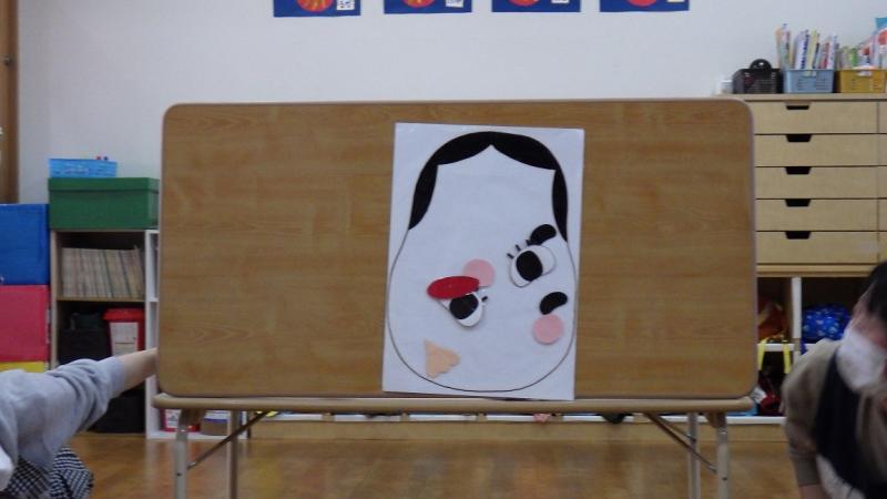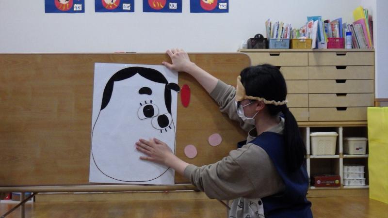 1月誕生日会では、みんなで正月あそびの「福笑い」をしました。