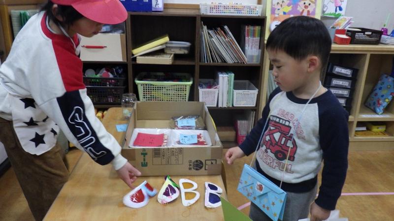 おさいふBAGにお金を3枚入れて、そら組さんのお店屋さんへお買い物に行きました。