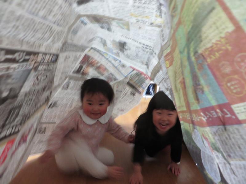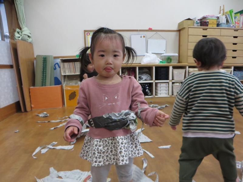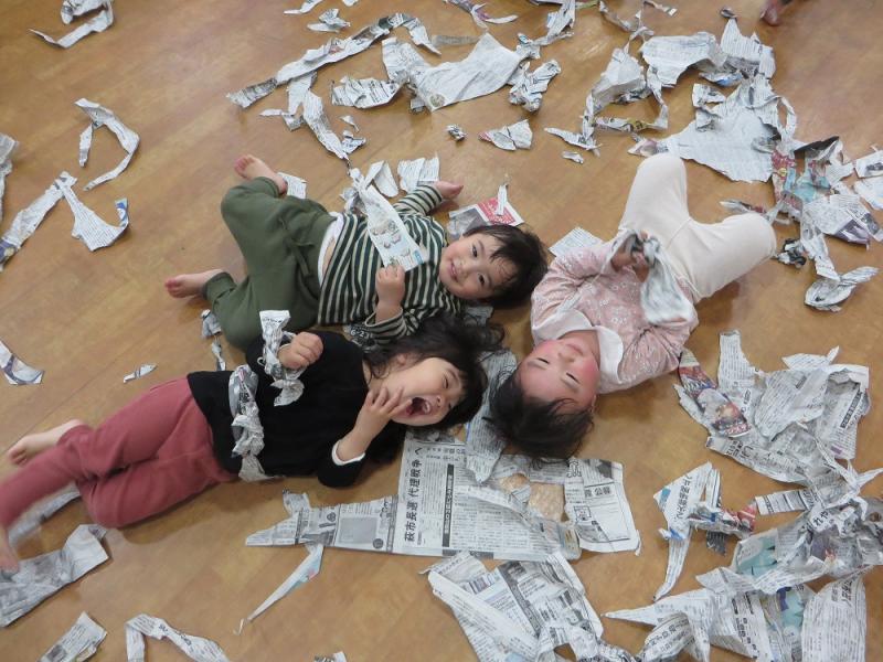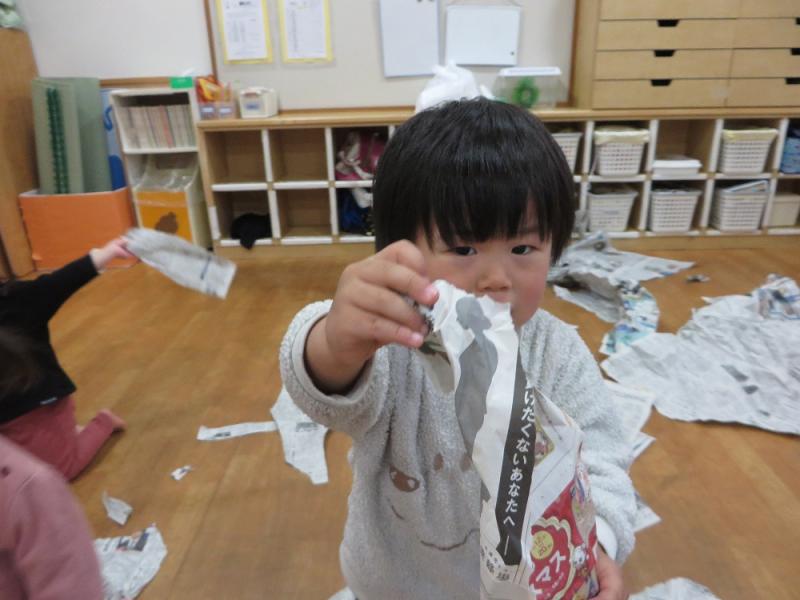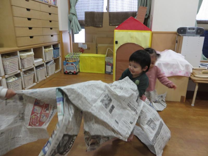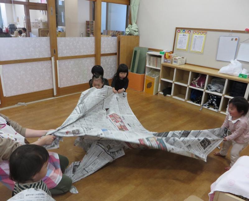 長い新聞紙を保育者と網引きごっこしたりと雨の日でもたくさん身体を動かして楽しむ