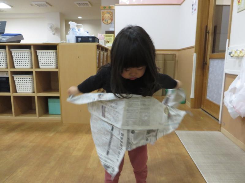 新聞紙をビリビリにやぶいたり、新聞ベルトや新聞ブレスレットを身につけ変身したり、