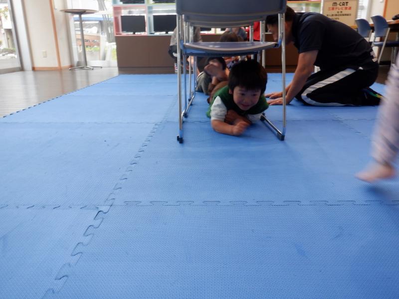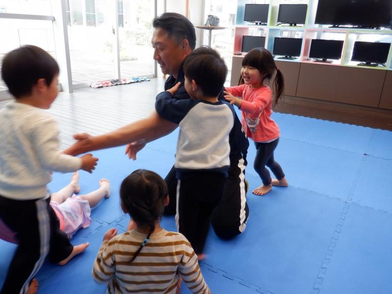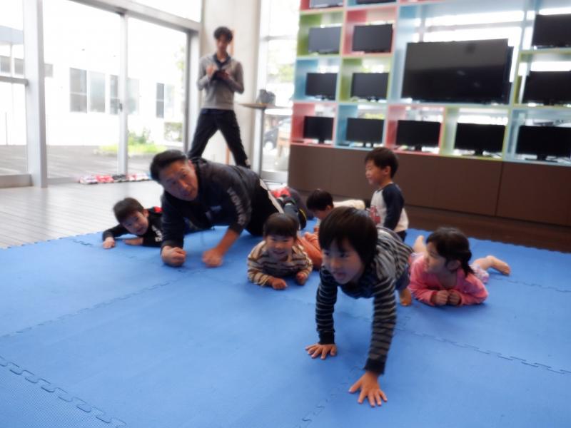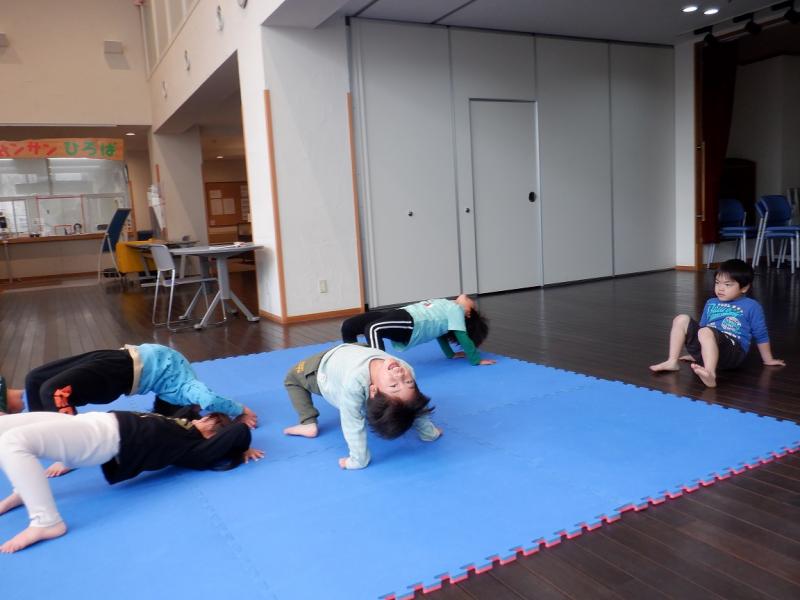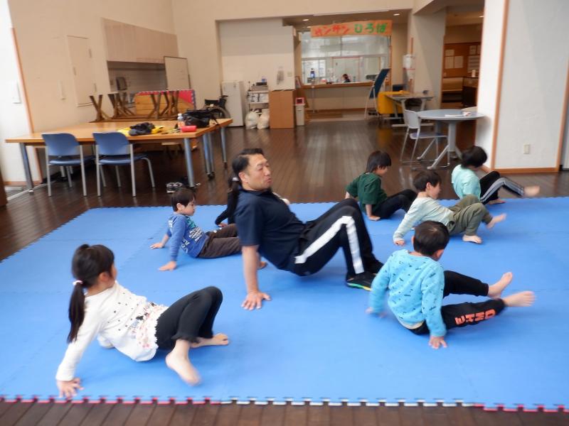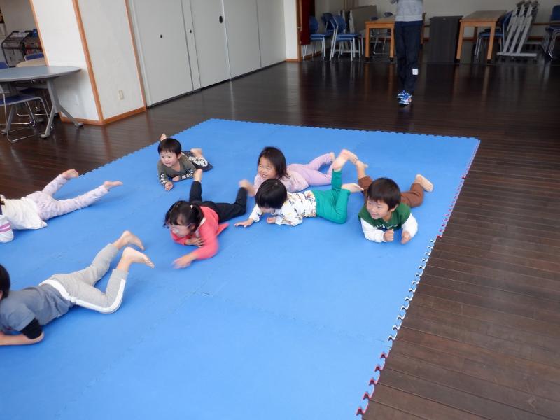 各年齢の発達にあった動きを取り入れ、はう・ジャンプ・前転・後転などを