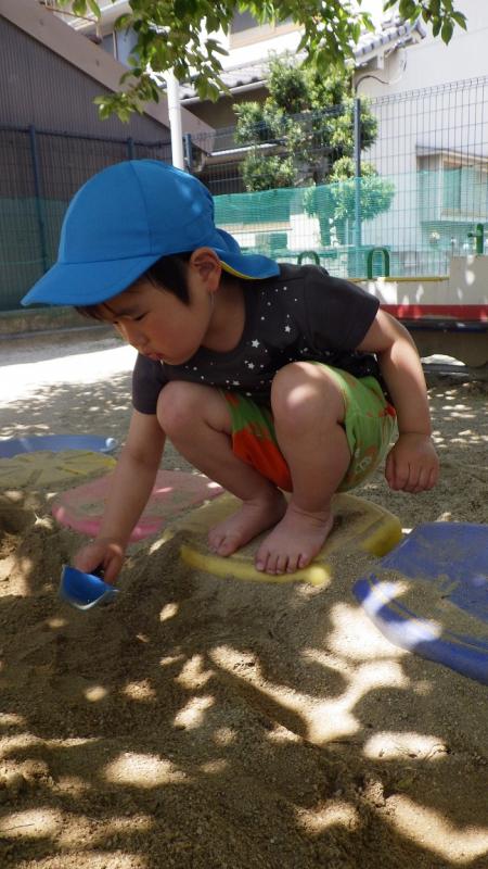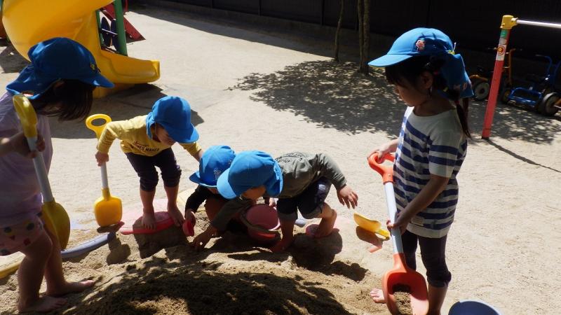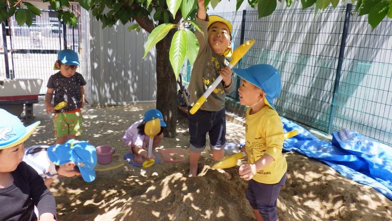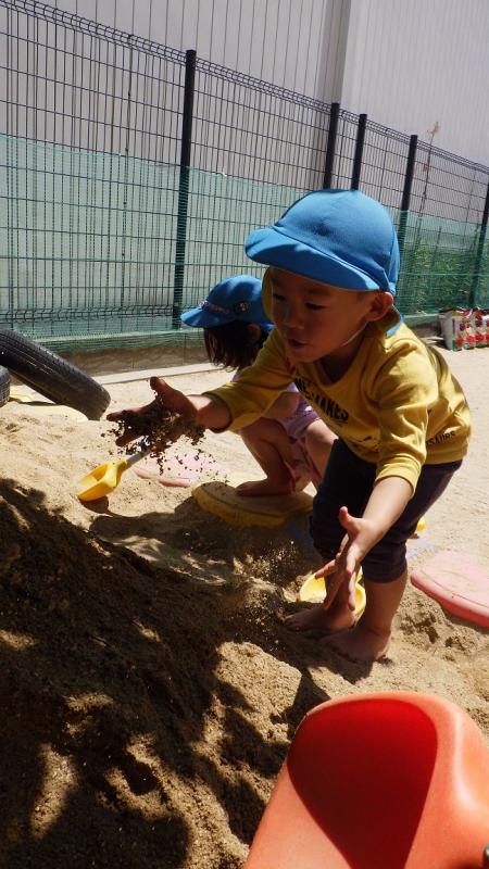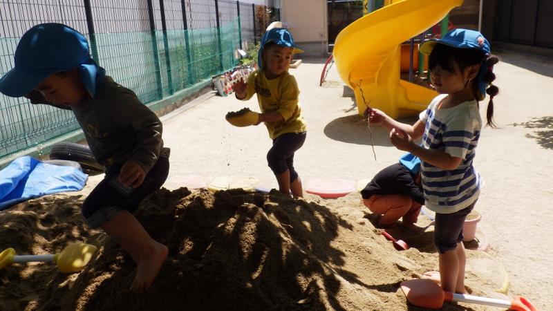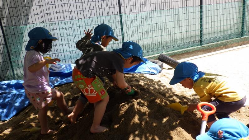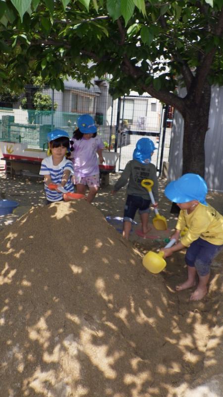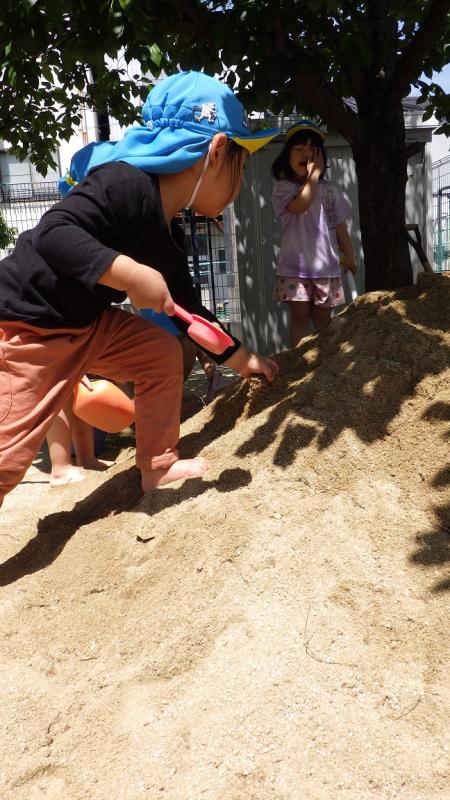 大きな山を作ったり、手でトンネルを掘ったりしながら砂あそびを楽しみました。