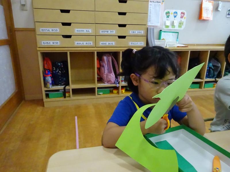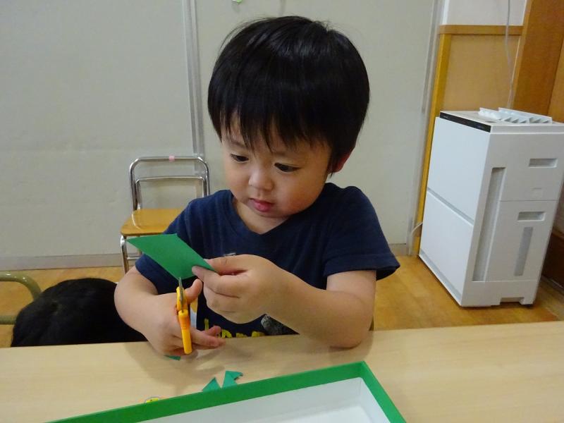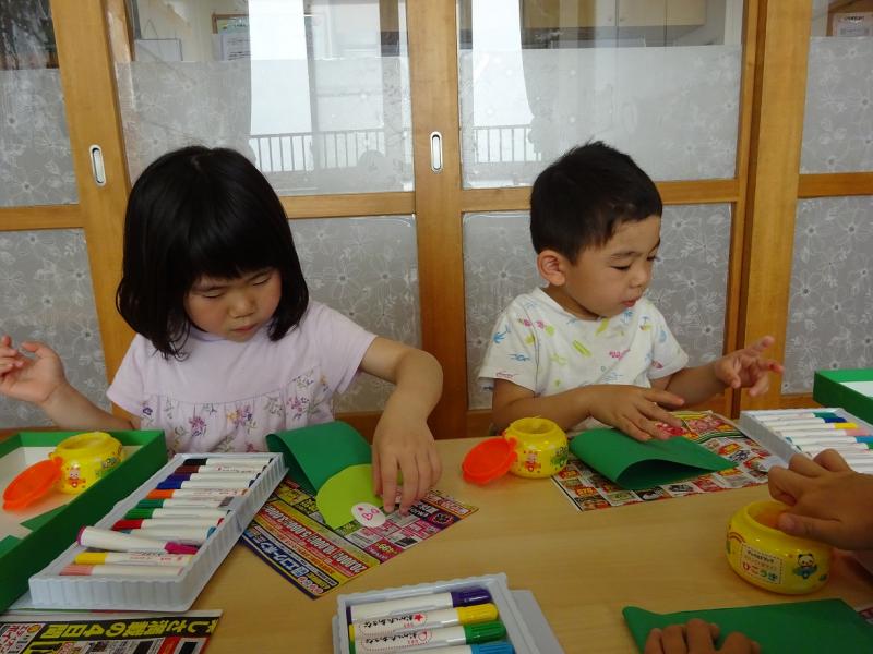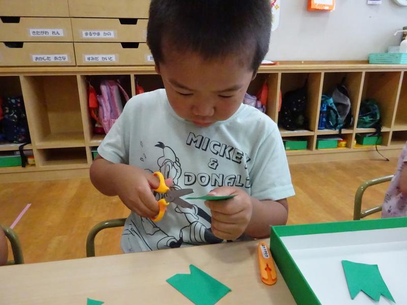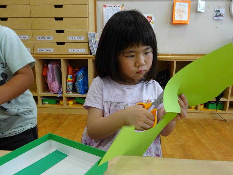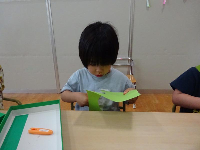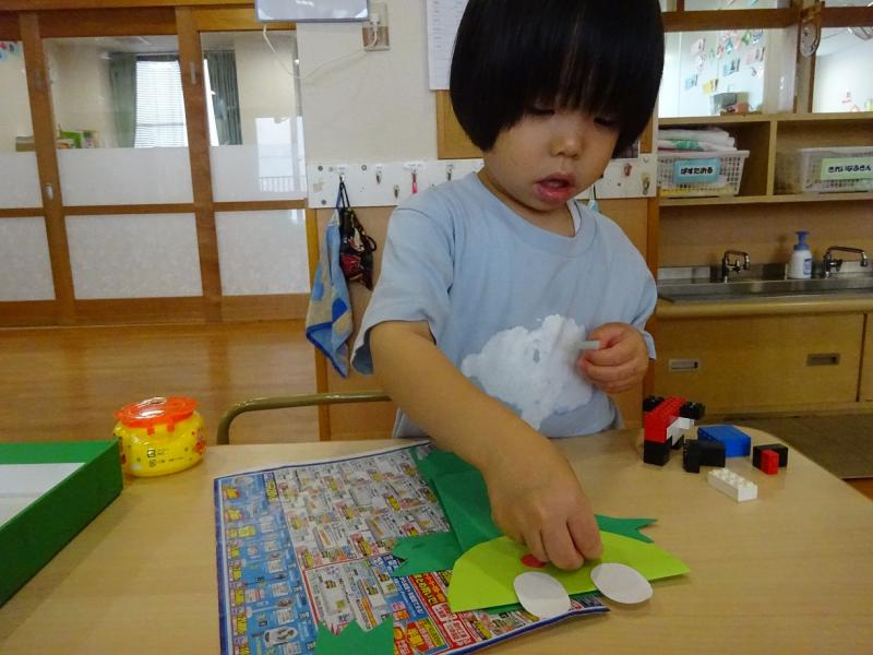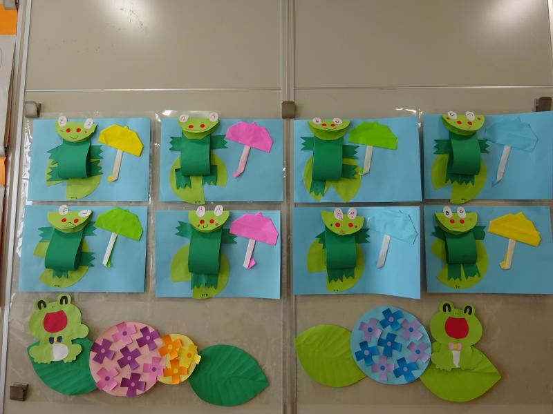 傘は折り紙でおり、カエルは画用紙でハサミ・のりを使い製作し、