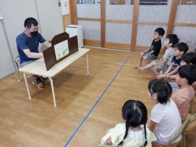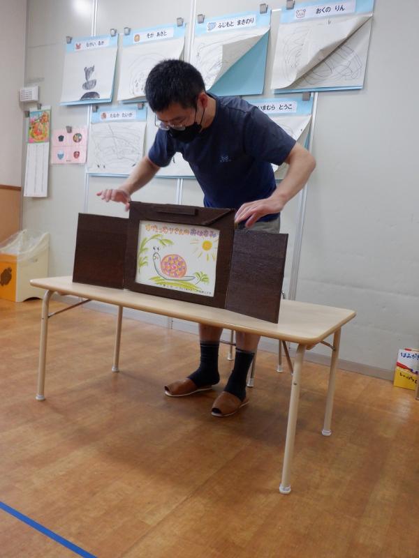 手作りの紙芝居の入れ物に興味津々の子どもたちでした。