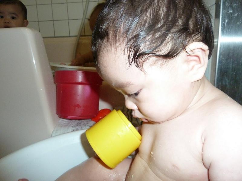 ひかり組(0歳児)・ゆき組(1歳児)たらいで水あそび!