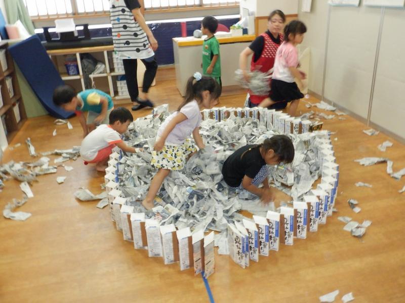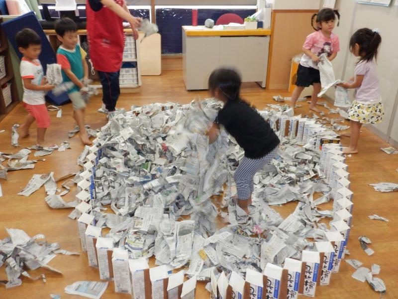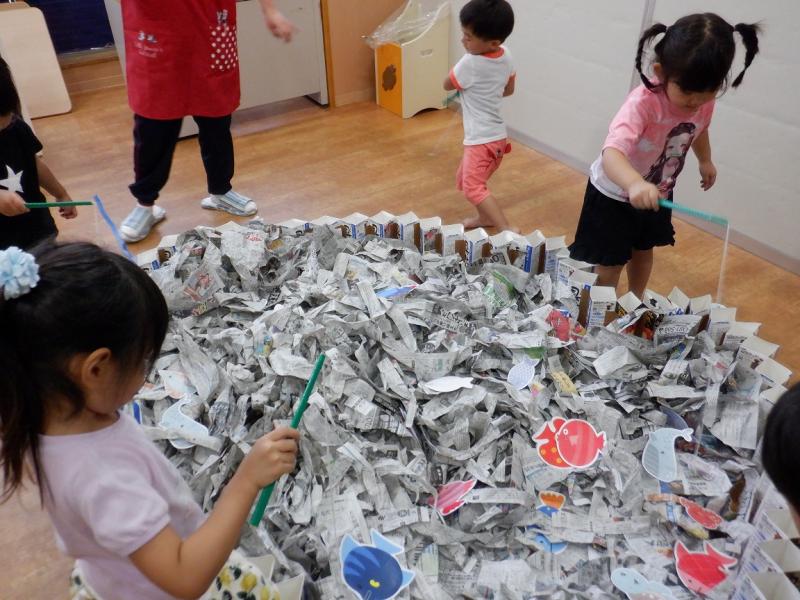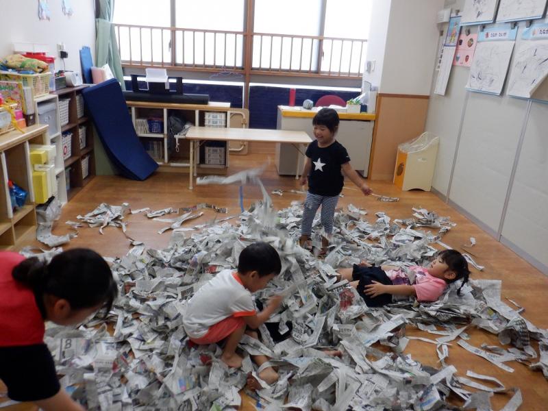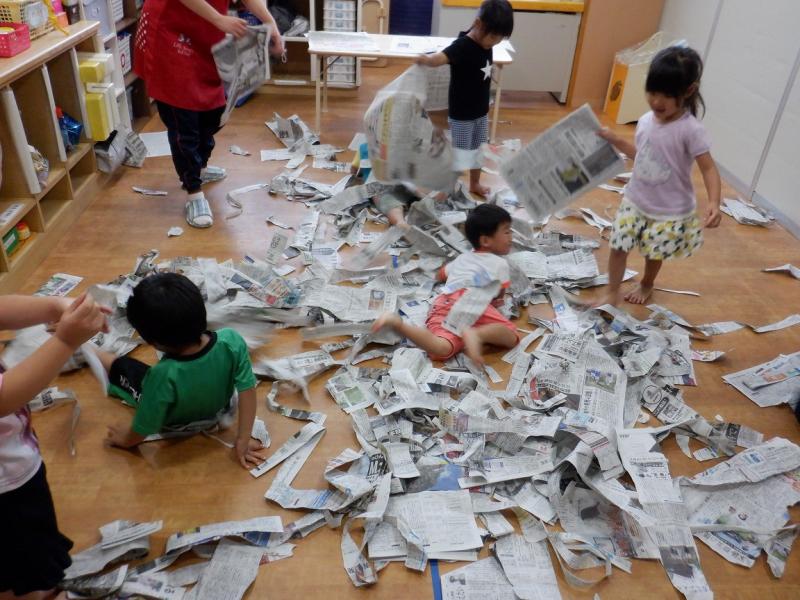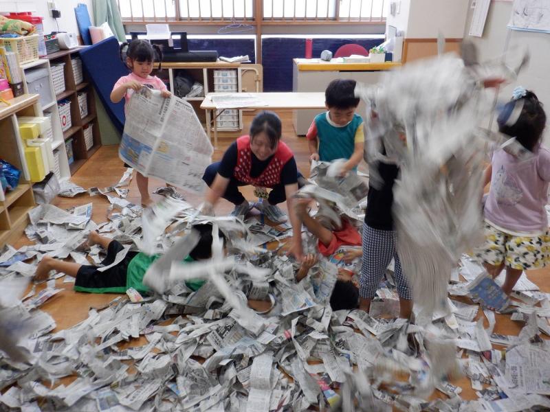 部屋いっぱいに新聞をやぶり海に見立て、新聞シャワーや泳ぐ真似をしたりして
