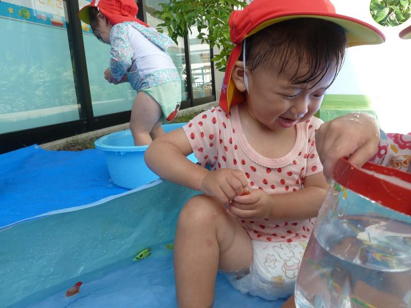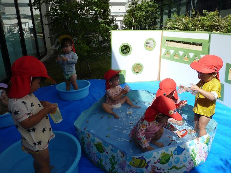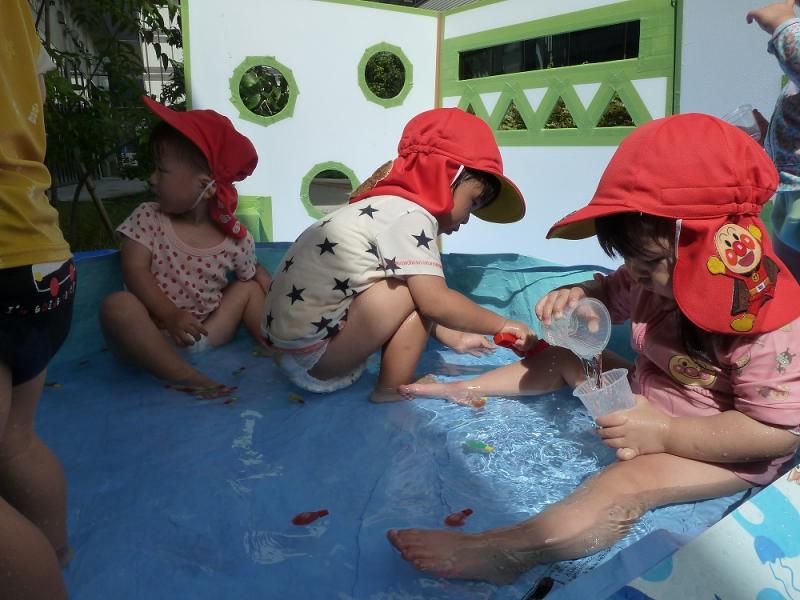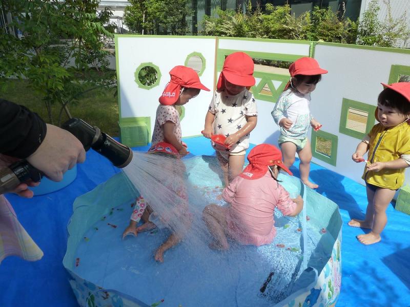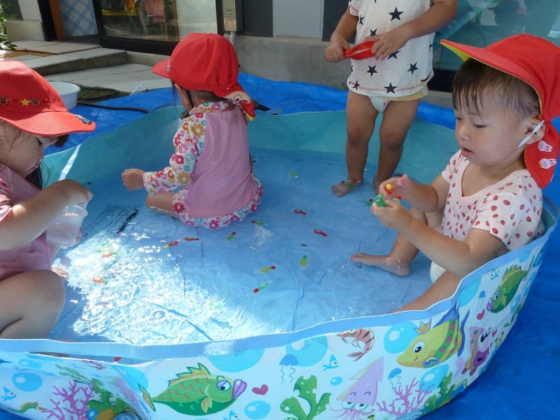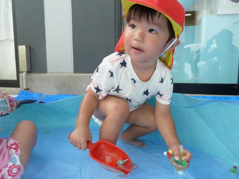 お魚すくいをしたり、水鉄砲で水を飛ばしてみたり、頭や顔に水がかかってもへっちゃら!!