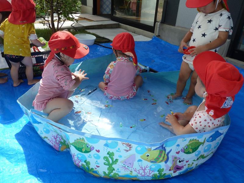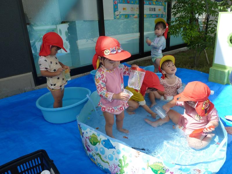 秋風を感じながら8月最終、ぽーと保育園のお友だちとプールで水あそびを楽しみました。