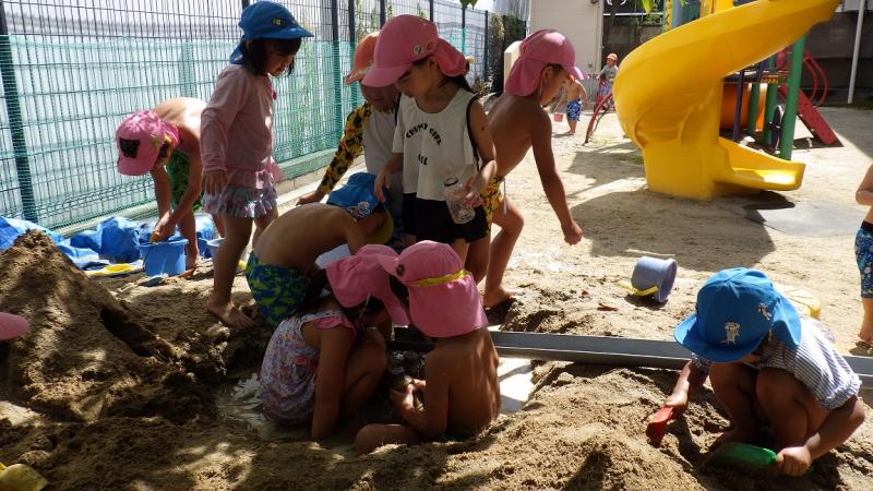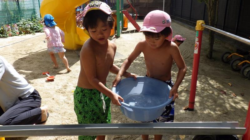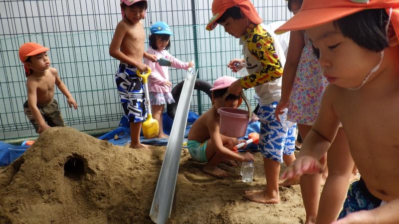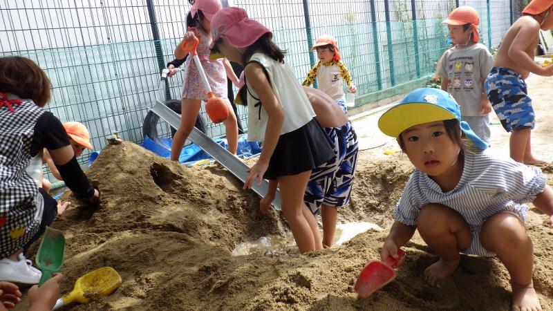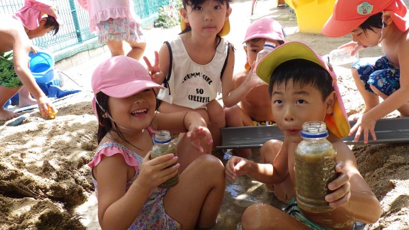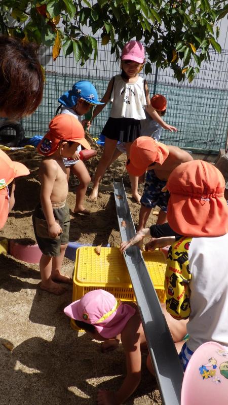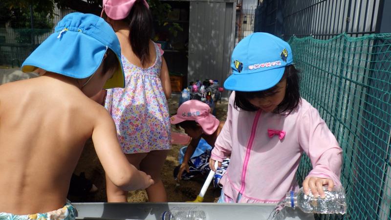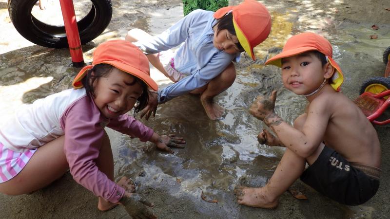 まだまだ暑い日が続いているので、幼児クラスで水・泥あそびを楽しみました。