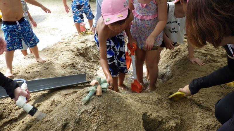 バケツやタライ、ペットボトルなどで一生懸命水を運び穴に流し入れたり、