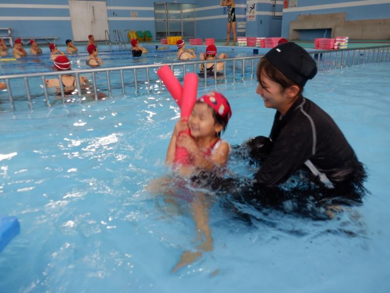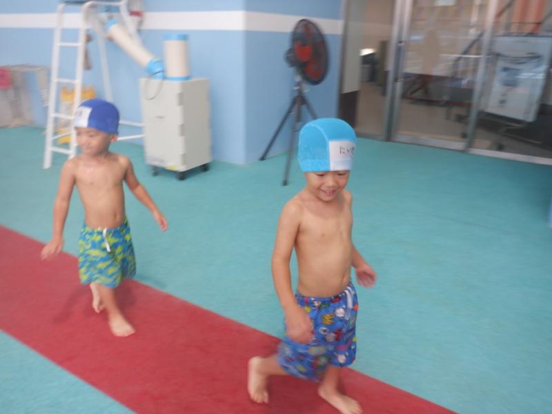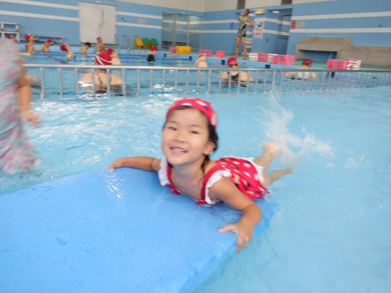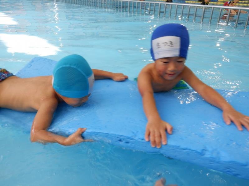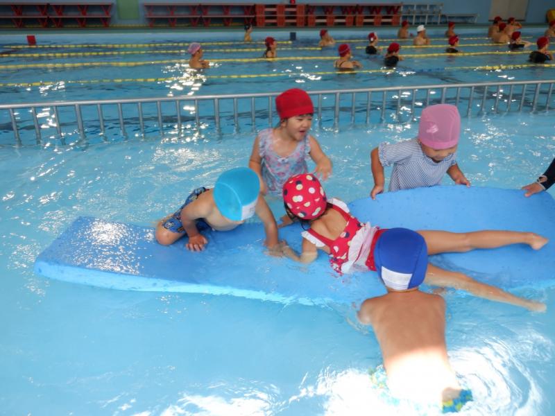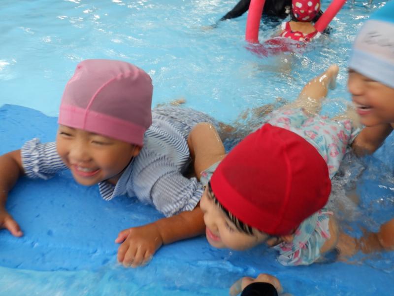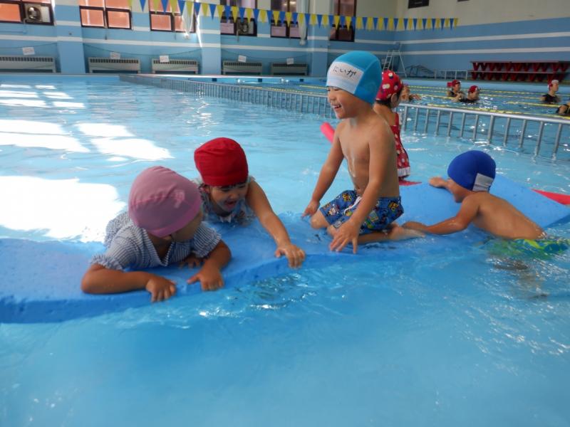 自由時間では、大きなビート板で遊んだり、列車ごっこをしたりして