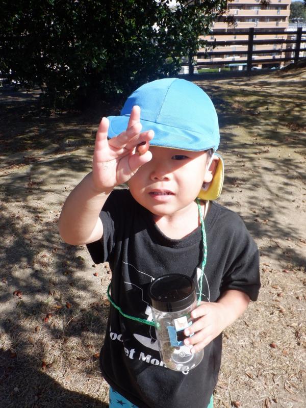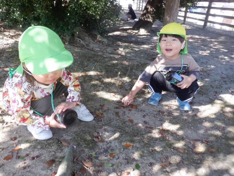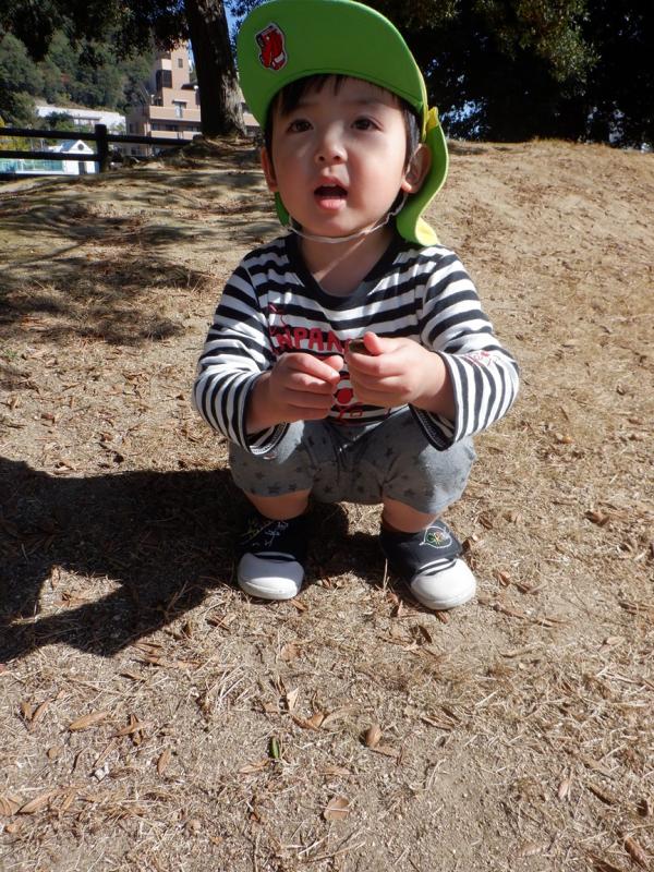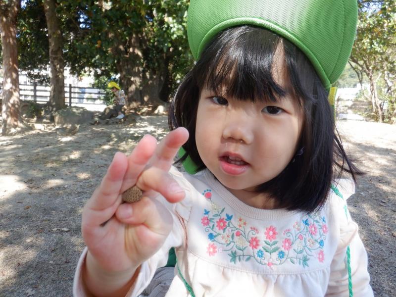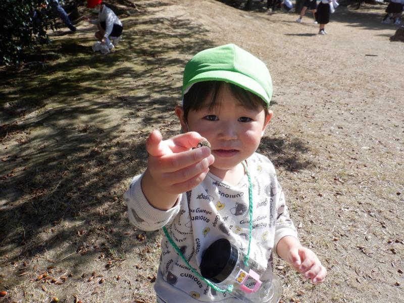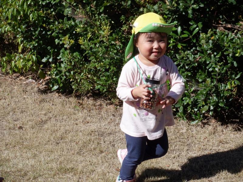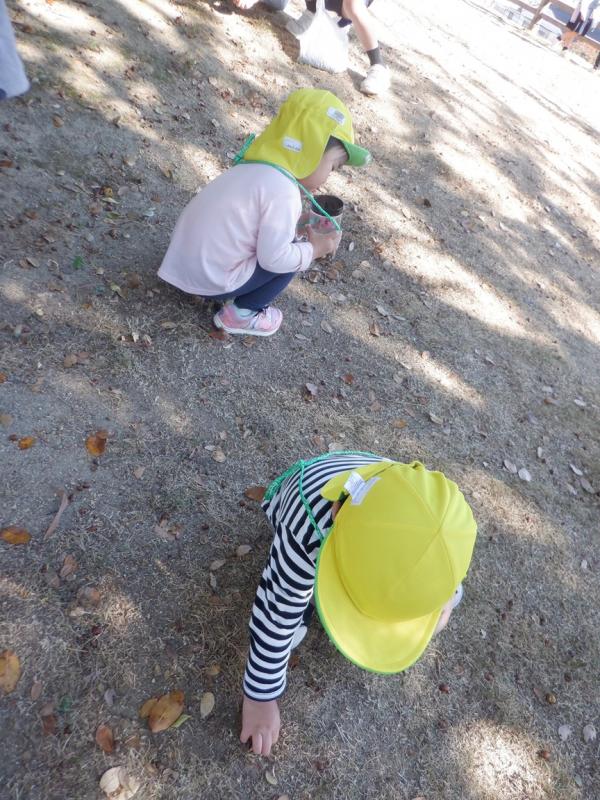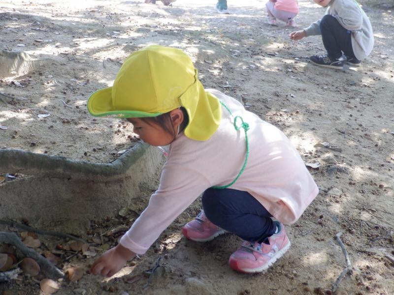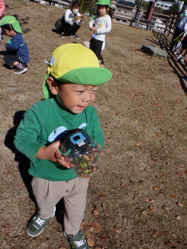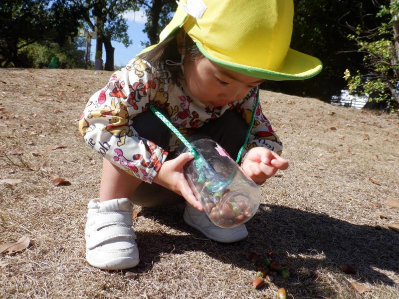 自分のどんぐりバックの中に夢中で拾い、「ぽとん、ぽとん」と、たくさん入れてましたよ。