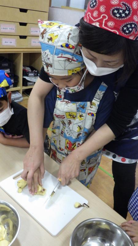 包丁は、保育者が「猫ちゃんの手にするよー」と、伝えるとみんな手を上手にに丸くして