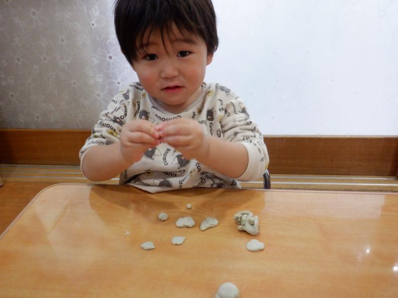ねんどを小さくちぎったり、細くヘビ状に伸ばしたり手や指先を使いながら遊んでいきました。