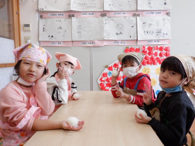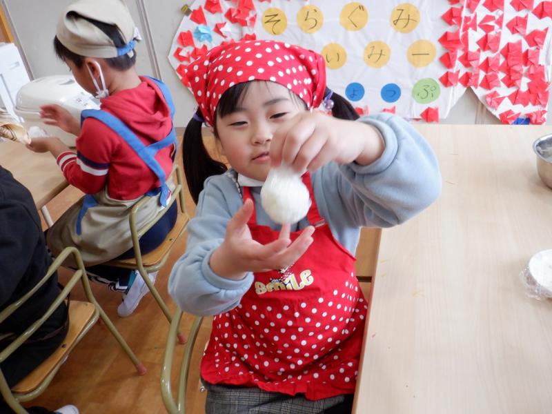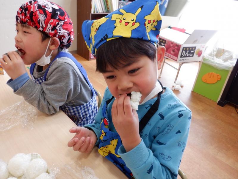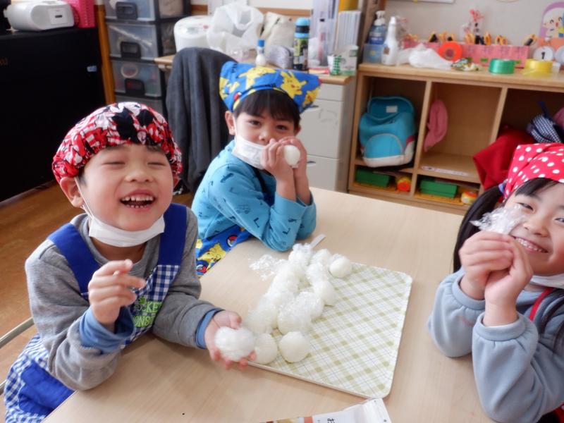 ラップにご飯をのせてにぎって味付けのりを巻いて、みんなで美味しく食べました。