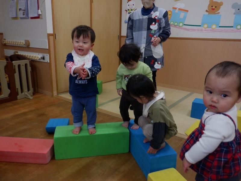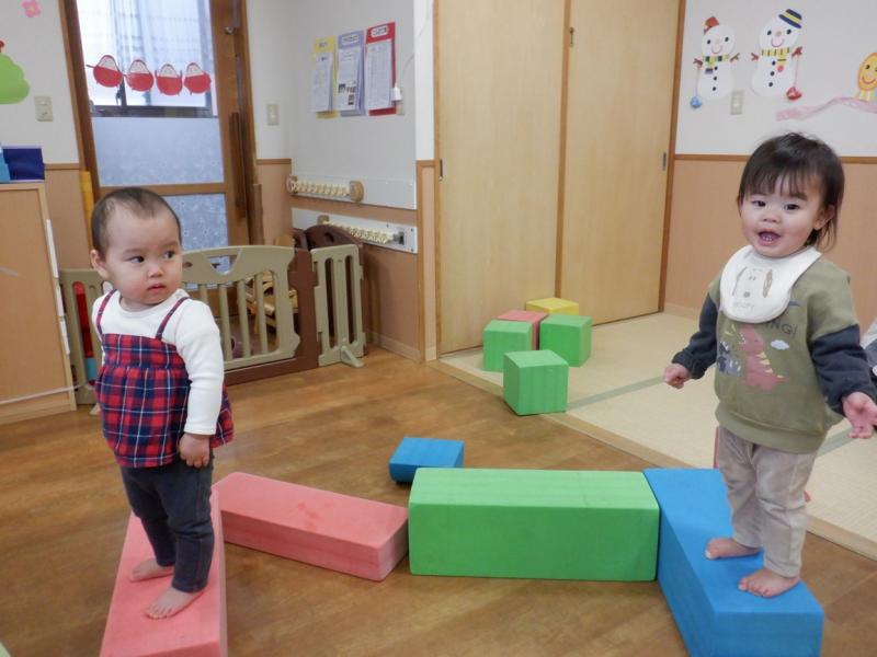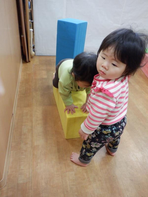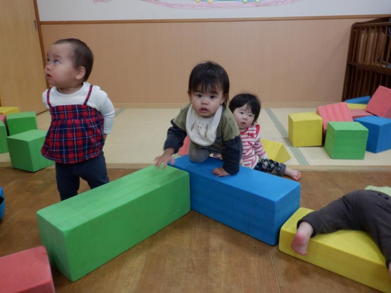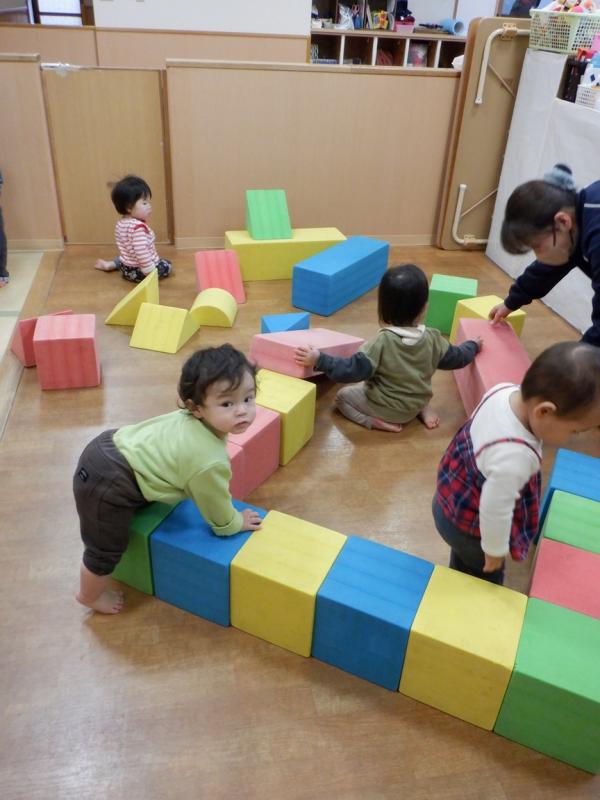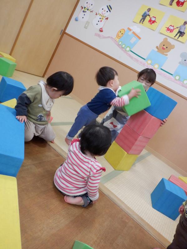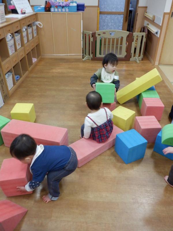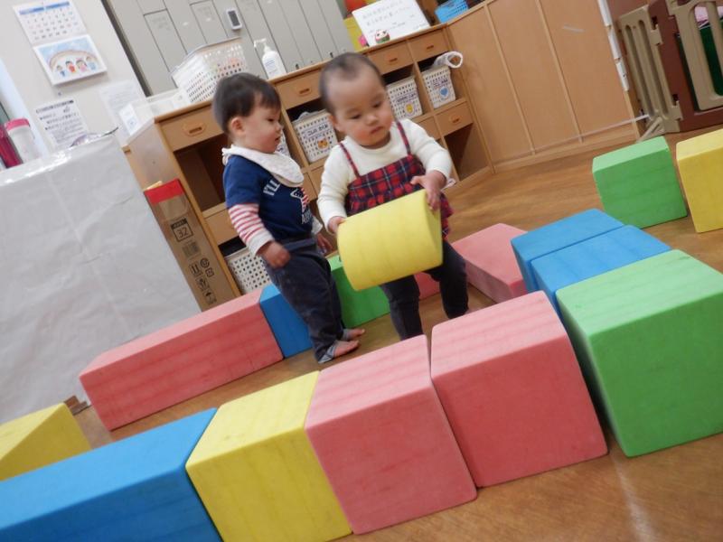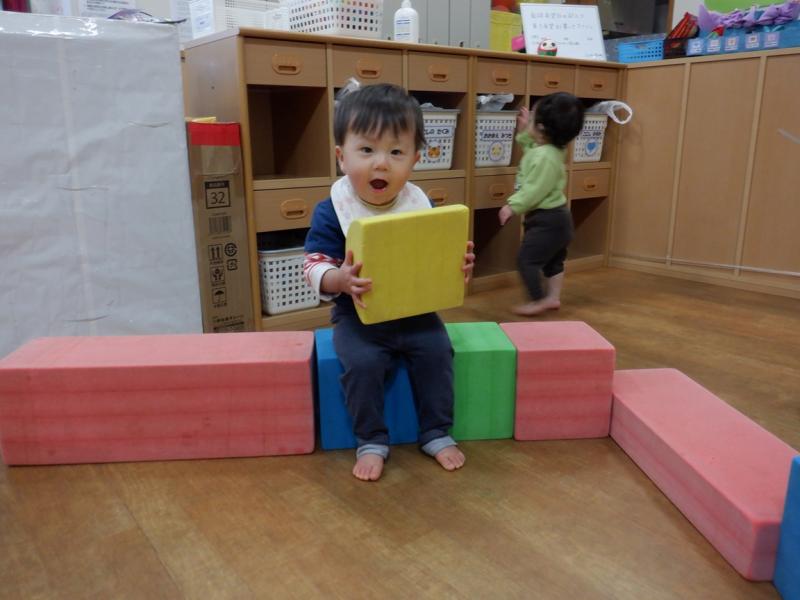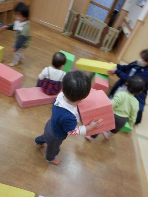 いろんな形、いろんな色のソフトブロックを運んでくると、