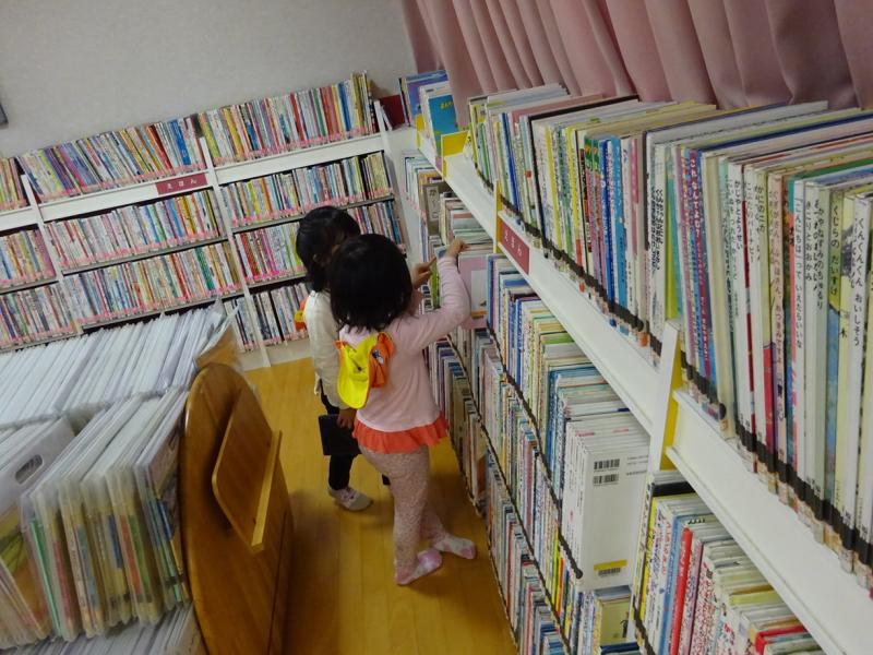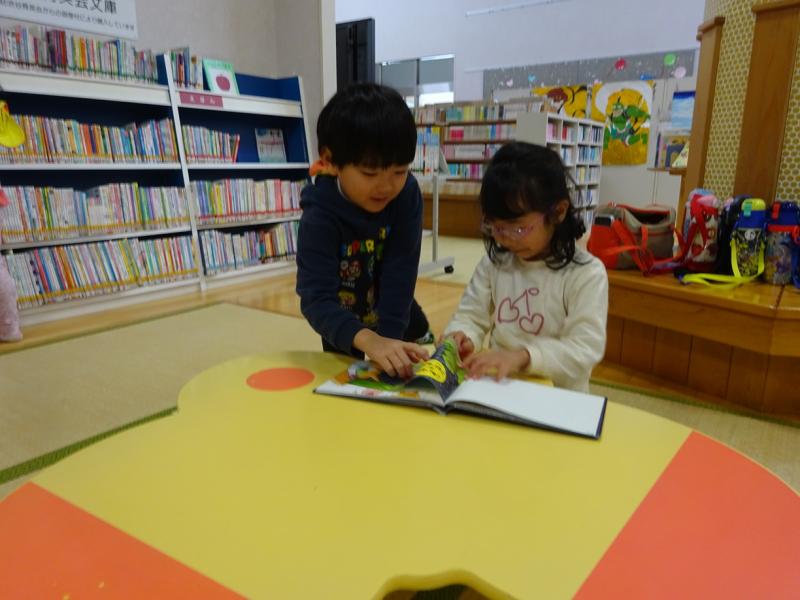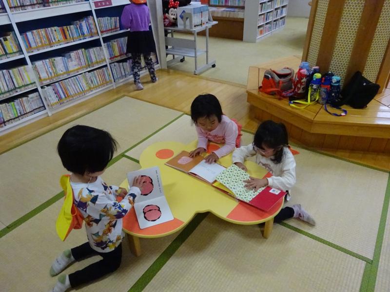 図書館では、保育園にない絵本にたくさん触れてお友だちと一緒に楽しむ姿がありました。