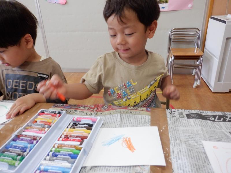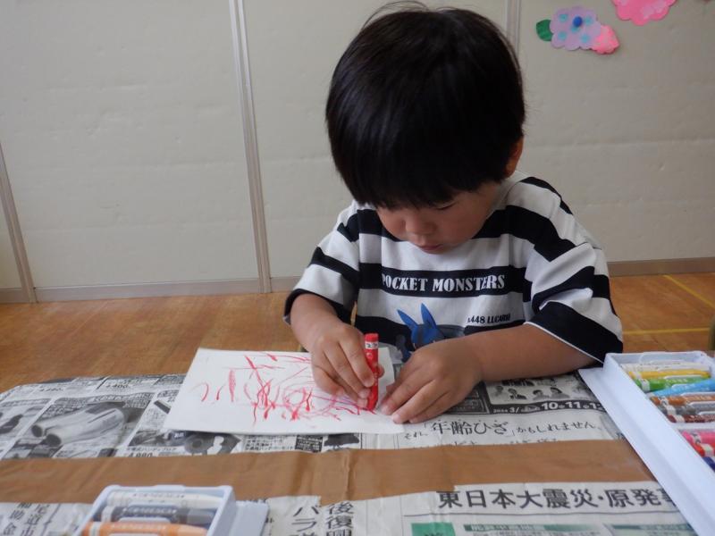 まずはクレヨンを使って好きな色で自由に模様を描き、