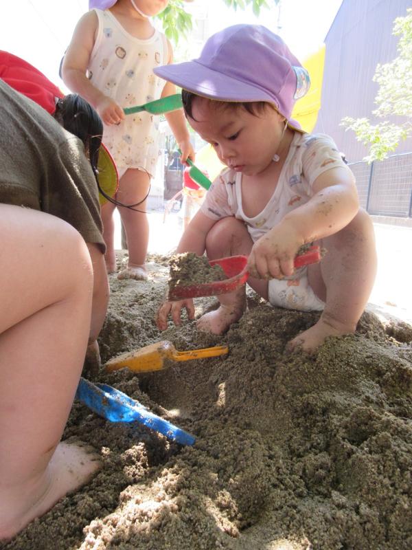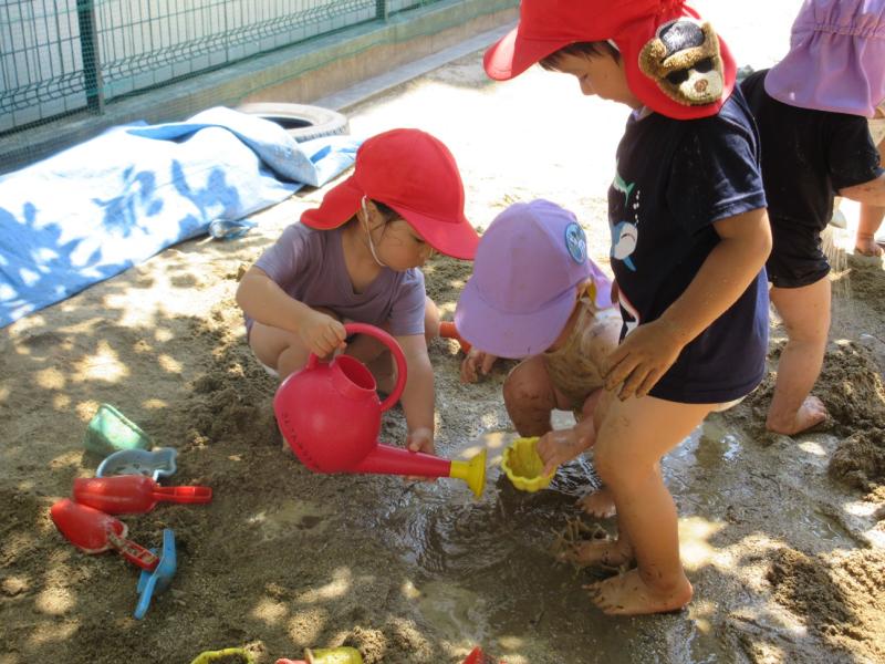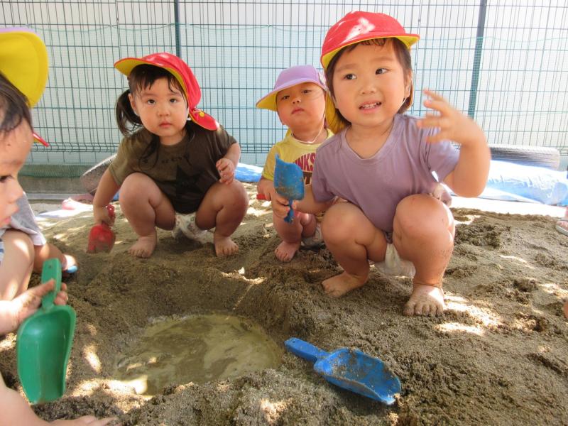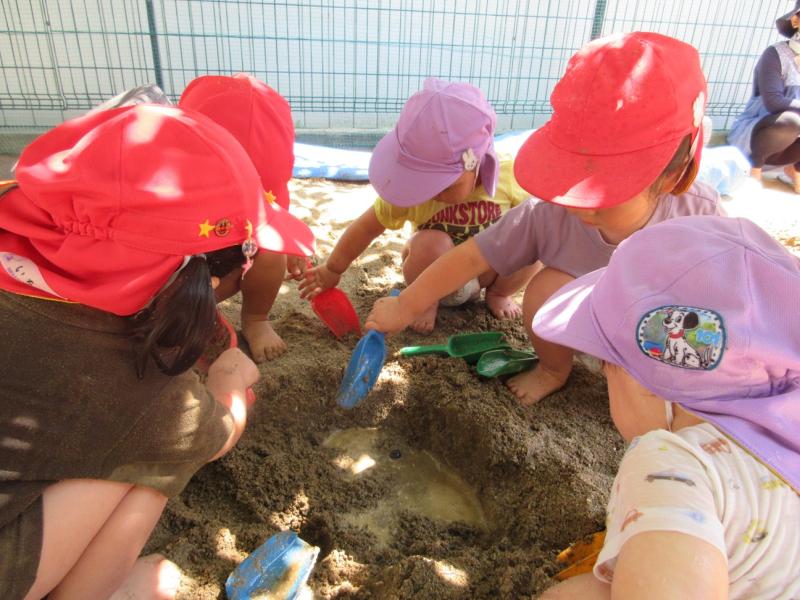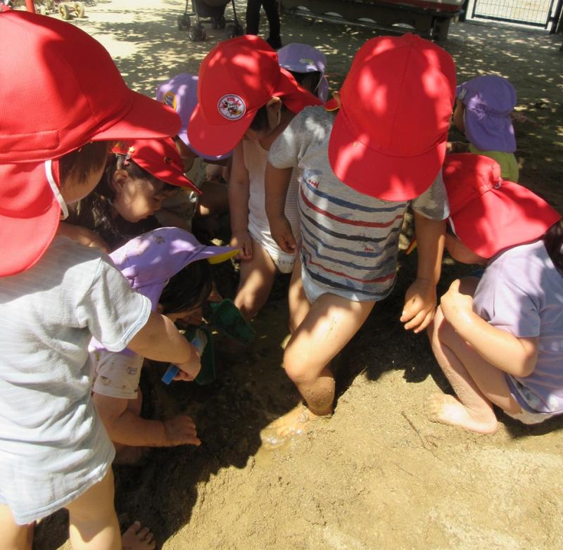 水を運んだり穴を掘ったり水たまりに入ったり、泥で手や足を隠すなど砂や泥の感触を楽しむ